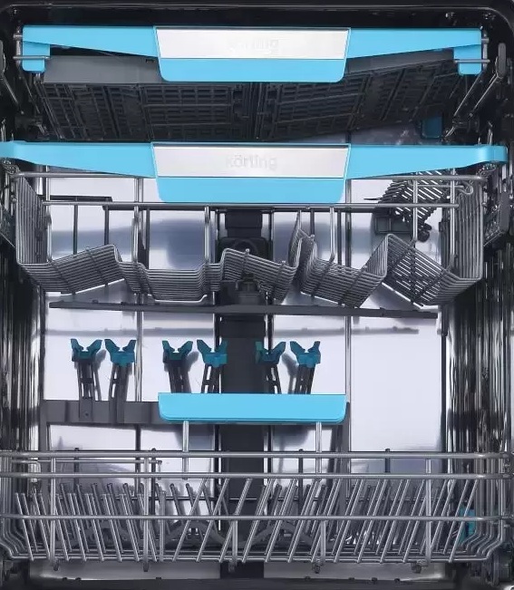 Посуда размещается в трех корзинах. Верхняя корзина C-Shelf предназначается для столовых приборов. Вторую корзину можно отрегулировать по высоте. Две корзины оснащены складными направляющими для тарелок и съемными полками для чашек и мелких предметов. В нижней корзине размещаются кастрюли и сковороды. Благодаря трем разбрызгивателям S-Form струи воды с моющим средством полностью охватывают все пространство камеры. Возможно применение комбинированных моющих средств «три в одном».