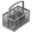 Корзина для столовых приборов — один из обязательных аксессуаров, которыми оснащается любая посудомоечная машина. Она представляет собой сетчатый пластиковый органайзер, в котором устанавливаются в вертикальном положении ложки, ножи и вилки. Корзина, как правило, разделяется на отдельные отсеки, в каждый из которых можно поместить один или несколько предметов. Зачастую сверху она закрывается специальной крышкой, которая также служит для разделения приборов, способствуя более тщательному их мытью.