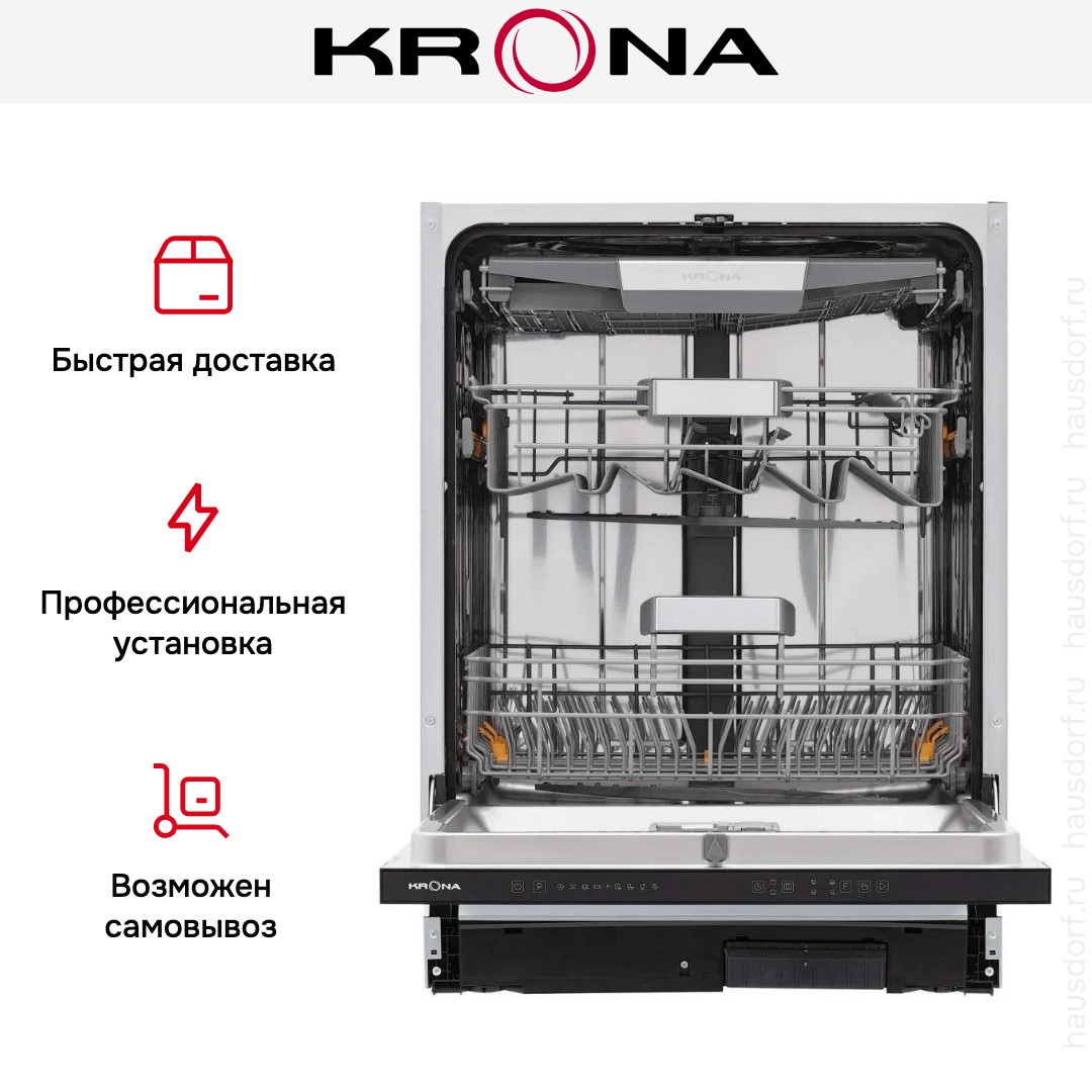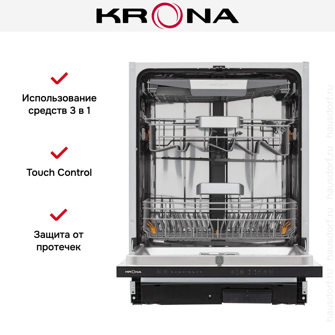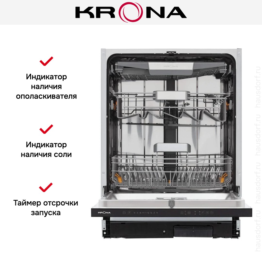 Посудомоечная машина Krona Martina 60 BI V2 — полностью встраиваемая полноразмерная модель, созданная для аккуратной интеграции в кухонный гарнитур. Глубина 56 см и стандартная ширина 59,8 см позволяют разместить прибор в большинстве ниш для встраивания. Черная панель управления отлично сочетается с фасадом под навес и остается аккуратной при скрытой установке под дверцей. Жесткое крепление фасада обеспечивает плотное и ровное прилегание дверцы к корпусу, что сохраняет эстетичный вид встроенного модуля.