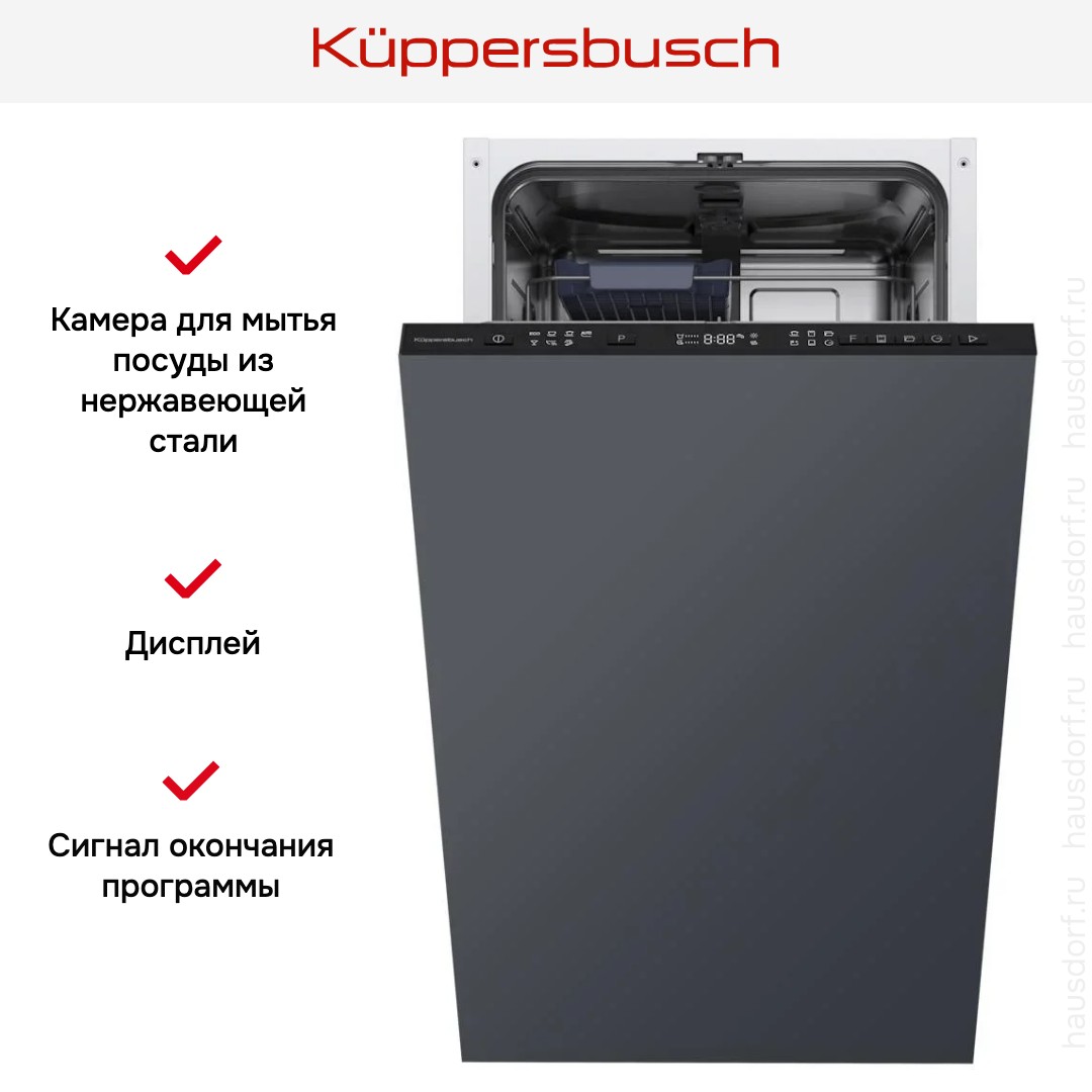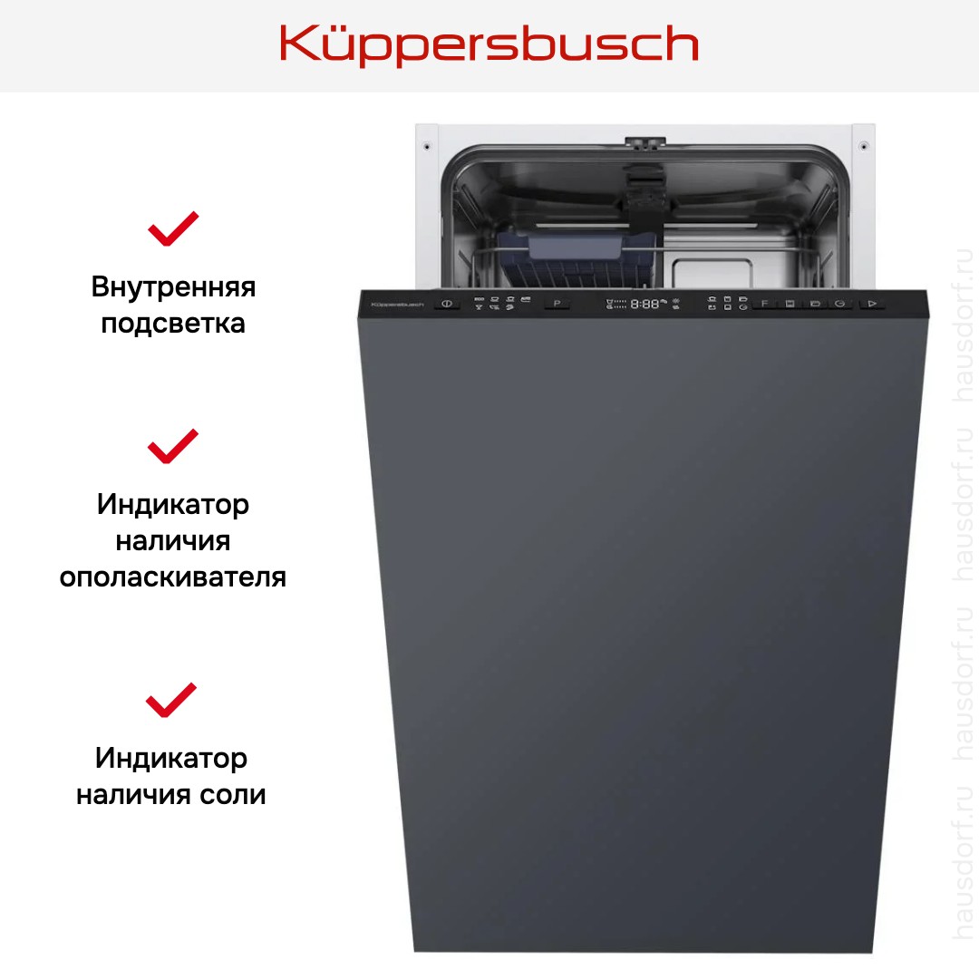 Посудомоечная машина Kuppersbusch G 4320.0 V — это встраиваемая техника небольшой ширины, которая легко впишется даже в не очень большую кухню. Корпус рассчитан на навес декоративного фасада, при этом панель управления скрыта в торце дверцы и совсем незаметна, когда прибор закрыт. Габариты 81.5—86.5×44.8×55 см и рекомендации по нише 82—87×45×58 см упрощают подбор места. Возможность установки техники в колонну добавляет гибкости при планировании интерьера.