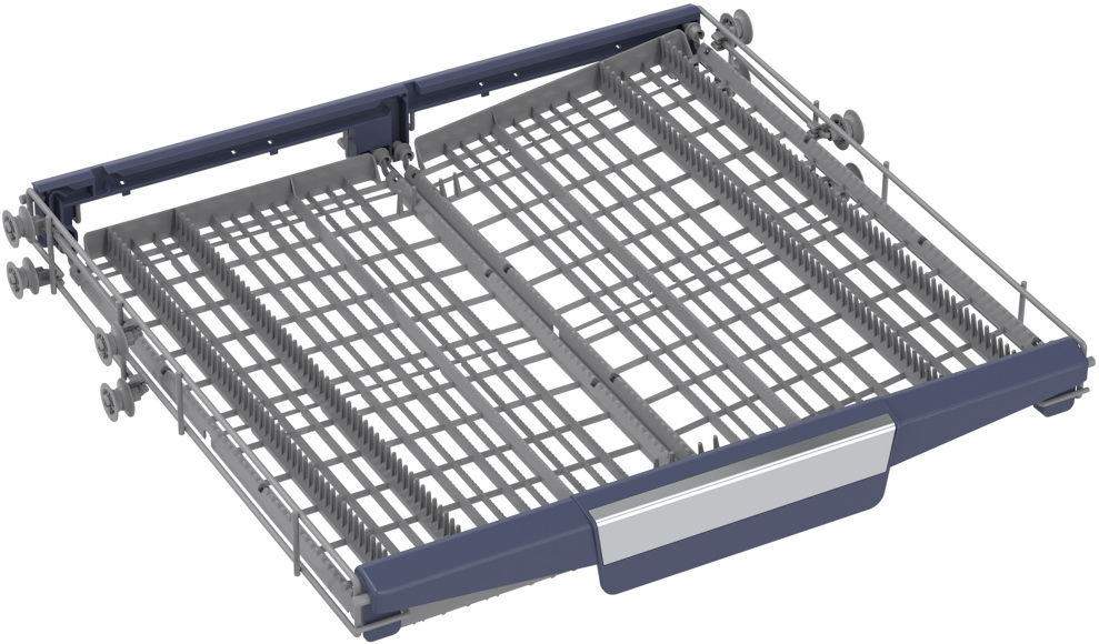 Корзина для посуды, которую можно регулировать по высоте даже при полной загрузке. Нужно нажать сбоку на фиксаторы большими пальцами и ладонью опустить или поднять короб.