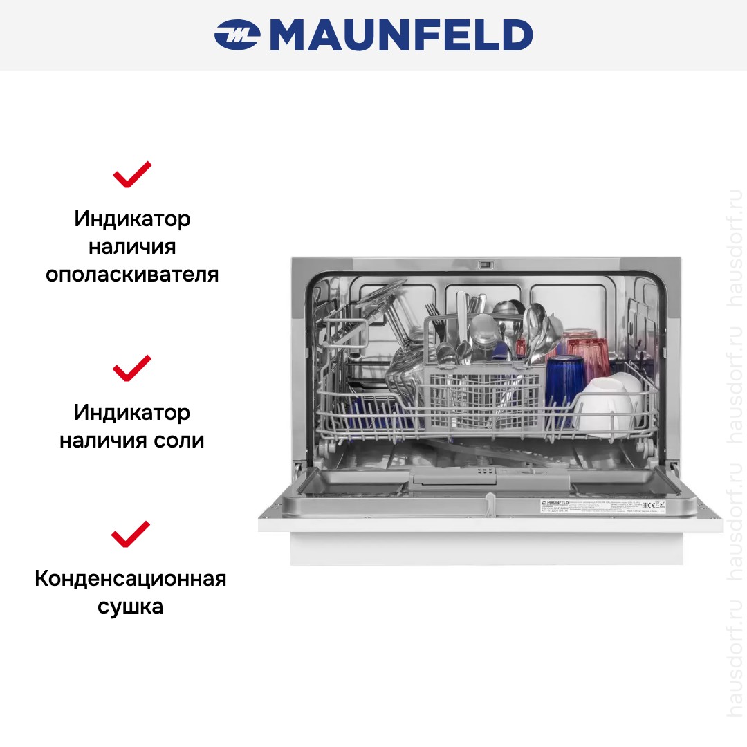 Посудомоечная машина Maunfeld MLP-06DW — идеальное решение для небольших кухонь, квартир-студий или дачных домиков, где важна экономия пространства без ущерба для функциональности. Благодаря компактным габаритам — всего 43,8 см в высоту, 55 см в ширину и 50 см в глубину — техника легко размещается даже в ограниченном пространстве, сохраняя при этом высокую производительность. Устройство рассчитано на одновременную мойку до шести комплектов столовых приборов и посуды, что делает его оптимальным выбором для одного-двух человек или небольшой семьи.
