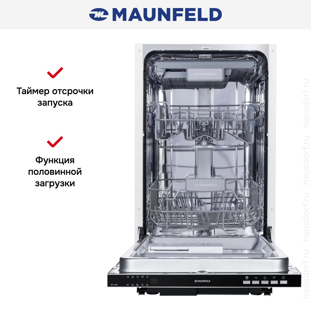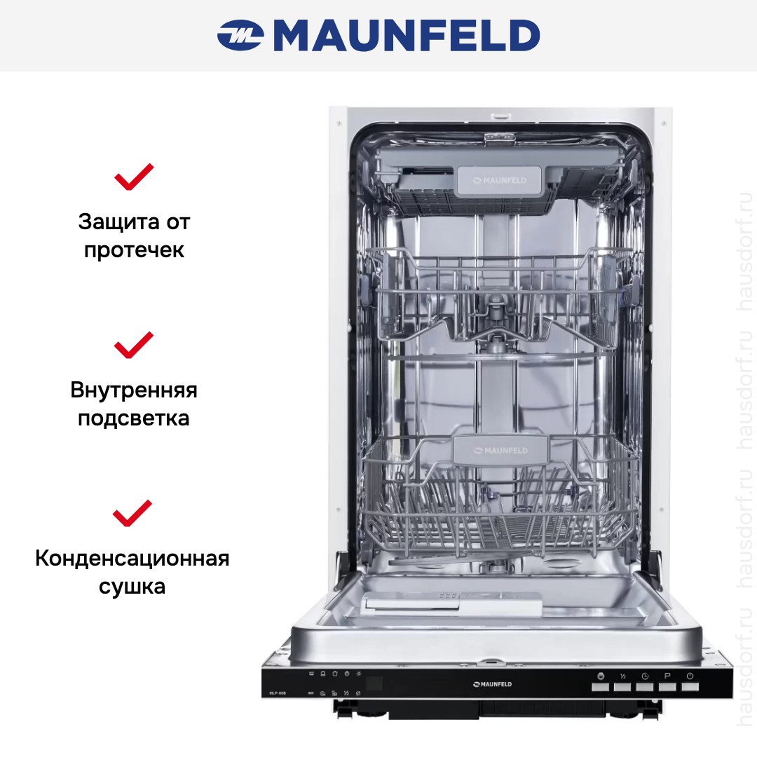 Полновстраиваемая посудомоечная машина MAUNFELD MLP 08B — оптимальное решение для современной кухни. Полная защита от протечек гарантирует безопасную работу прибора. А большой набор функций обеспечивает комфортное использование модели. Имеется выбор из 7 стандартных программ, в том числе быстрая мойка, которую можно использовать при малом загрязнении посуды. Несмотря на небольшую ширину модели, вы легко разместите внутри все необходимое благодаря регулируемой по высоте корзине и специальному лотку для столовых приборов.