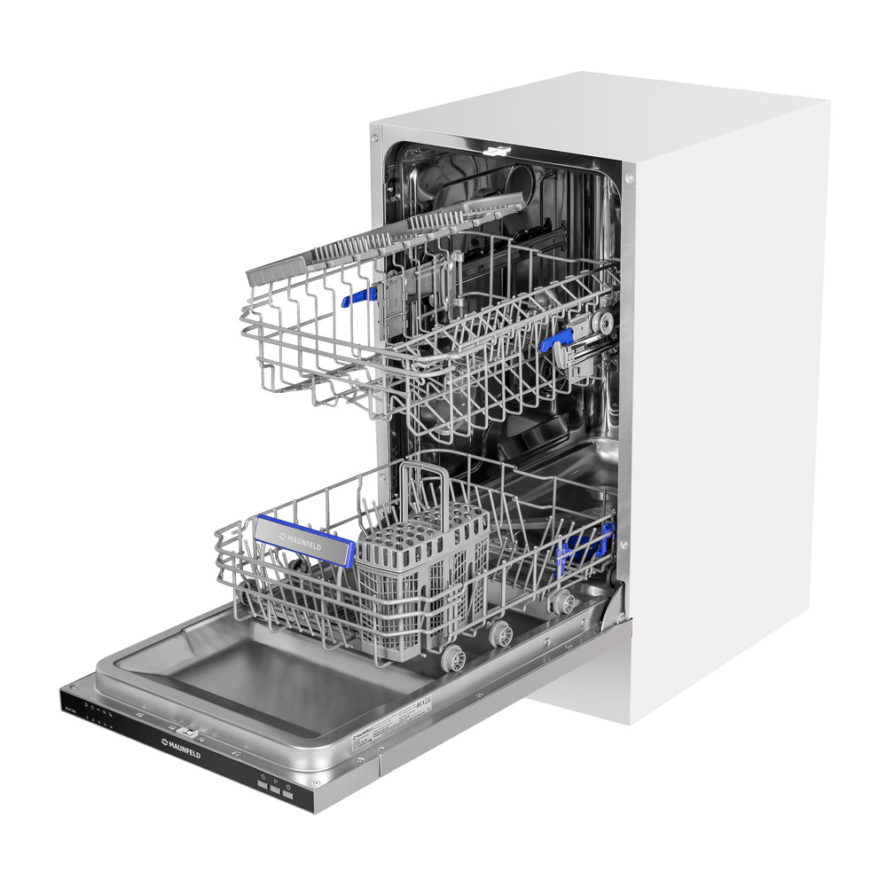 В базовую комплектацию посудомоечной машины входят сливной и заливной шланг, воронка для соли и держатель для шланга. Отдельно можно приобрести дополнительные аксессуары — подставку для столовых приборов, держатель для стаканов и т.д. Машинка MAUNFELD MLP08I является довольно узкой по сравнению с аналогами, ее ширина составляет всего лишь 44,8 см, что позволяет расположить ее в сравнительно небольшой нише.