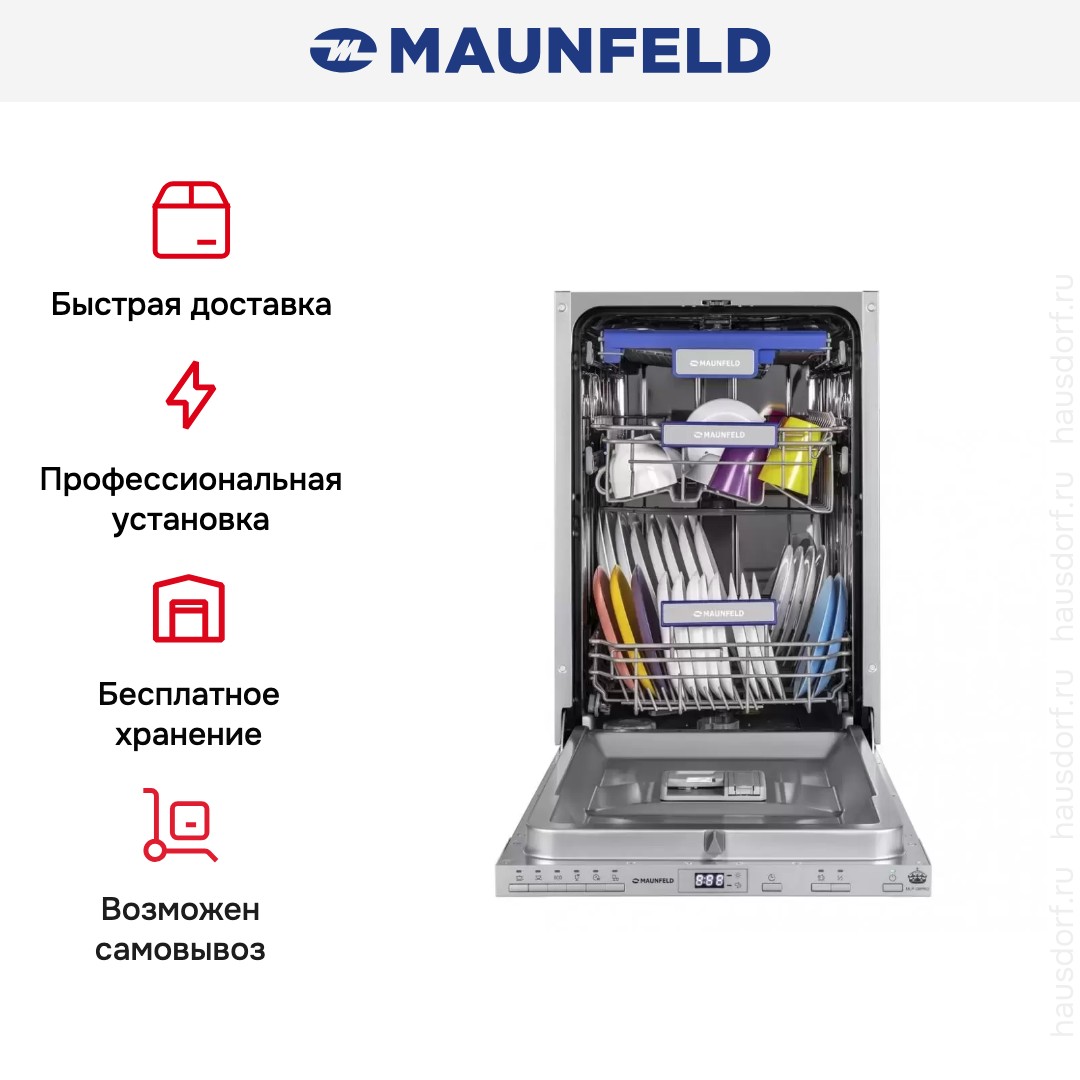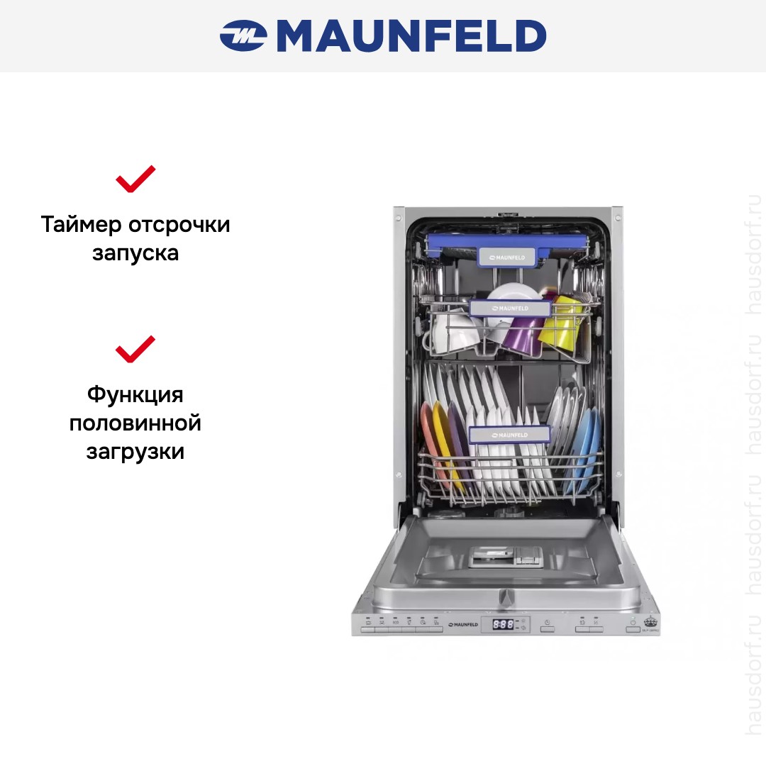 Встраиваемая посудомоечная машина MAUNFELD MLP08PRO хорошо подходит для небольшой семьи из двух или трех человек, она отличается компактностью и эффективностью. Основные достоинства модели: