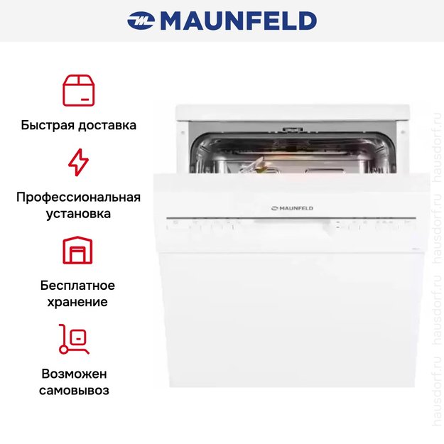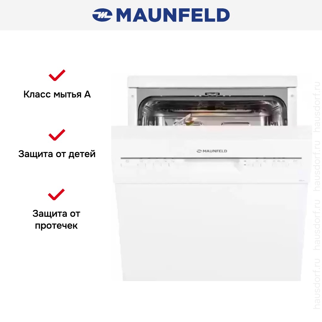 Отдельностоящая посудомоечная машина MAUNFELD MWF08S хорошо подходит для небольшой семьи из двухтрех человек. Габариты этой модели достаточно компактны, что позволяет легко вместить ее в небольшое пространство однокомнатной квартиры и даже студии, на которой кухонная зона всегда ограничена. Фронтальная загрузка позволяет также использовать крышку посудомоечной машины. Основные достоинства этой модели: