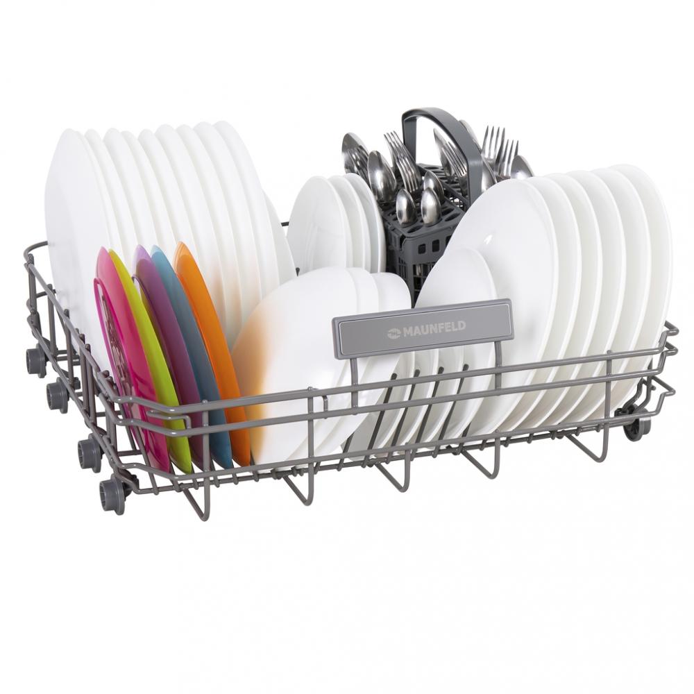 В основную комплектацию входят сливной и заливной шланг, воронка для соли, а также держатель для шланга. Держатели для бокалов расположены в верхней корзине. Также предусмотрена небольшая корзина для столовых приборов. Базовая программа мытья посуды в машине длится 90 минут при температуре 65 градусов, интенсивная — 160 минут при температуре 50-70 градусов. Специального режима для бережного мытья посуды не предусмотрено, однако программа быстрой очистки может быть использована в этих целях: 30 минут при температуре 45-55 градусов подходящий режим для тонкого стекла. В посудомоечной машине MAUNFELD MWF12S предусмотрена автоматическая защита от протечек: в случае отсутствия слива подача воды блокируется. Таким образом можно сделать вывод, что эта модель подойдет семье из нескольких человек, ее необходимо установить на достаточно просторной кухне, а функциональность порадует каждого.