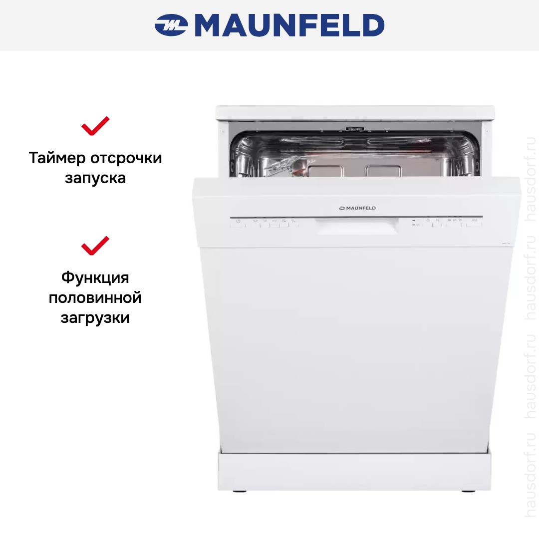 Посудомоечная машина MAUNFELD MWF12S отдельностоящая фронтального типа хорошо подходит для большой семьи. Это полноразмерная модель, рассчитанная на двенадцать комплектов посуды. Основными особенностями являются: