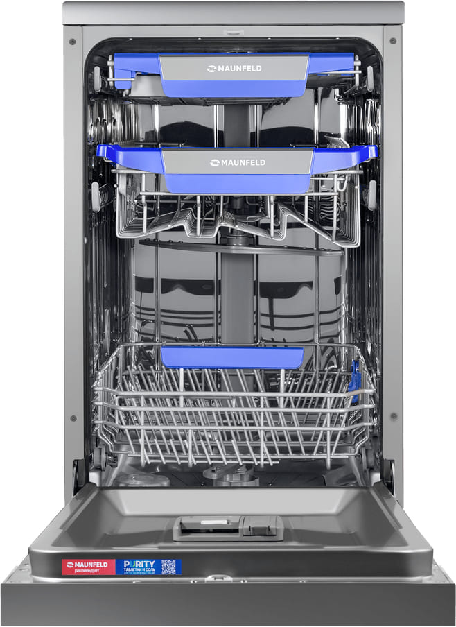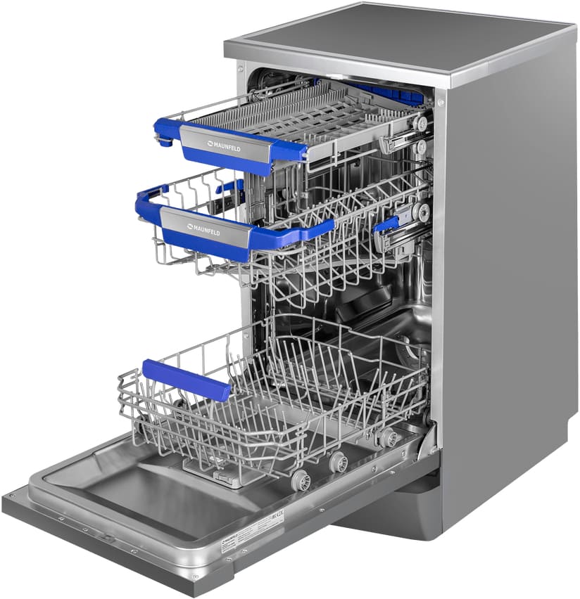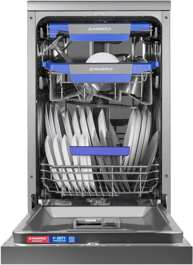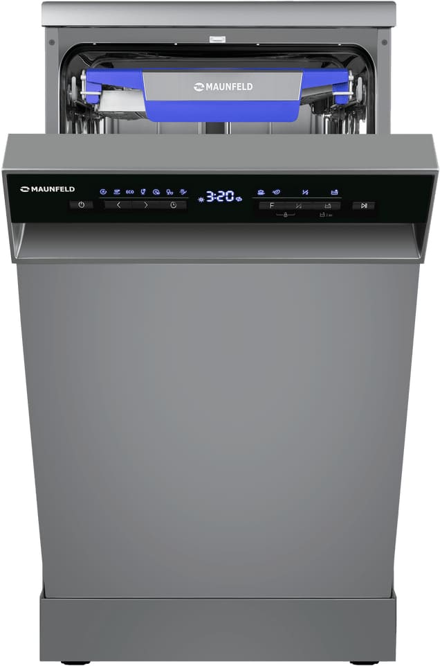 Отдельностоящая модель Маунфилд отлично впишется в кухонный интерьер, главное — правильно выбрать место, чтобы подвести коммуникации. Имеет уменьшенную ширину — благодаря этому поместится даже на очень маленькой кухне. В камеру можно загрузить ограниченное число комплектов: 10 шт. Комплектом считается набор посуды на одного человека, который нужен для полноценного приема пищи: глубокая и плоская тарелки, тарелка для салата, блюдце под чашку, сама чашка, ложка и вилка.