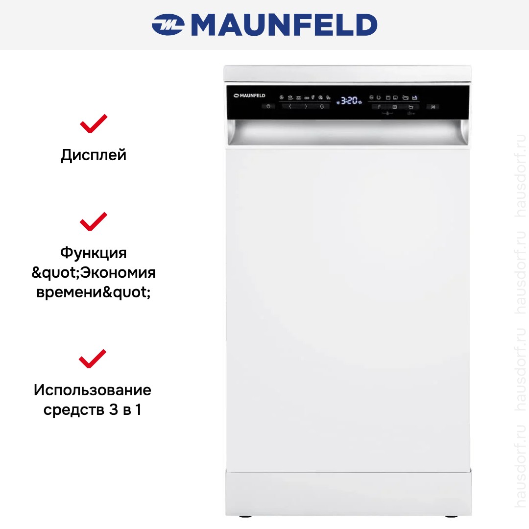 Посудомоечная машина Maunfeld MWF45331W-Inverter. Дизайн сочетает белый корпус с контрастной черной панелью управления, что делает прибор аккуратным и современным. Передняя панель открытая, с цифровым дисплеем и простыми кнопками включения и выбора программы. Узкие габариты в 44.8 см по ширине позволяют вписать устройство в компактную кухню без потери функциональности.