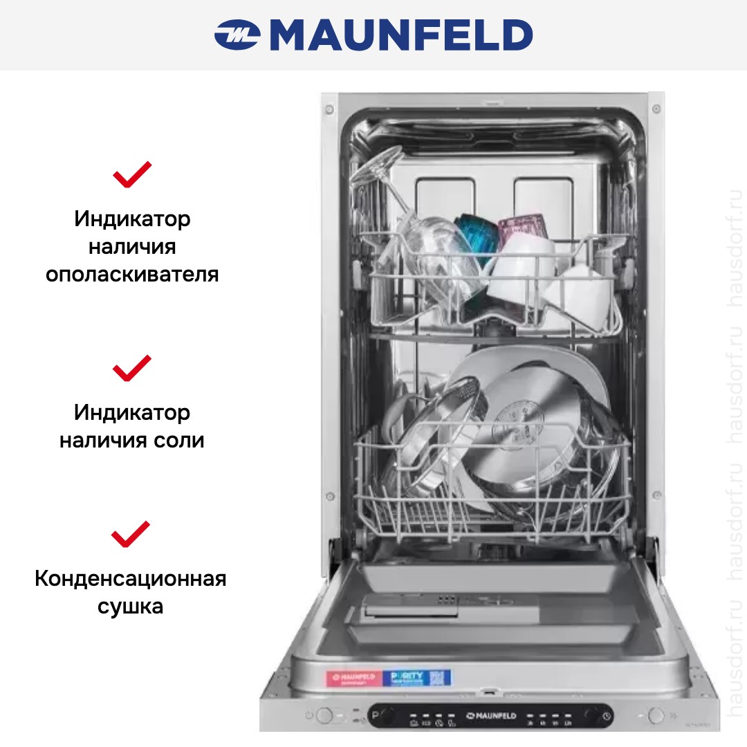 Посудомоечная машина Maunfeld MLP4249G02 Light Beam — встроенная, полностью интегрируемая узкая модель, созданная для аккуратной встройки в кухонный гарнитур. Ее компактные габариты 81.5×44.8×55 см и требуемая ниша 82×45×55 см позволяют установить прибор даже в тесной кухне. Фронтальную панель можно закрыть фасадом вашего шкафа, а декоративная панель управления выполнена из нержавеющей стали с черными элементами, что добавляет солидности и долговечности внешней части.