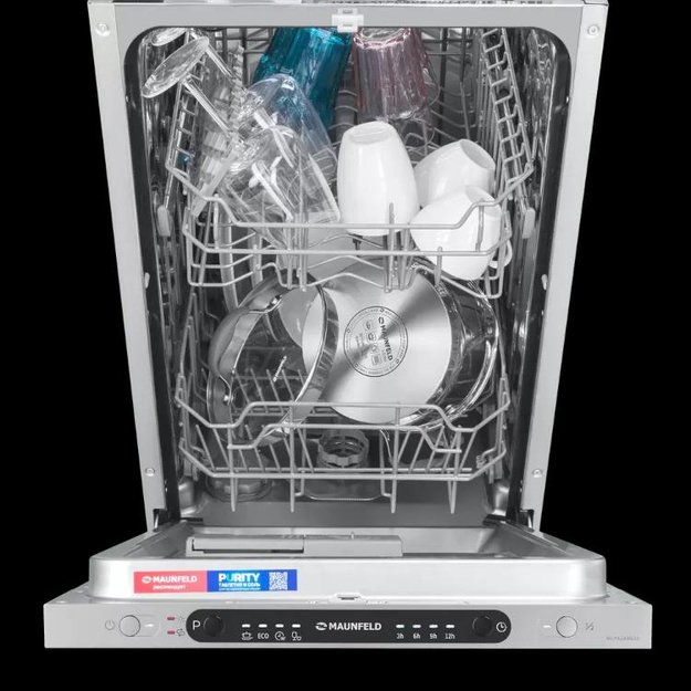 Встраиваемая модель Маунфилд отлично впишется в любой интерьер, главное — правильно выбрать место, чтобы подвести коммуникации. Устанавливается в нишу целиком, полностью закрывается декоративной панелью. Обратите внимание: в комплекте не идет фасад, его необходимо установить самостоятельно. Имеет уменьшенную ширину — благодаря этому поместится даже на очень маленькой кухне. В камеру можно загрузить ограниченное число комплектов: 9 шт. Комплектом считается набор посуды на одного человека, который нужен для полноценного приема пищи: глубокая и плоская тарелки, тарелка для салата, блюдце под чашку, сама чашка, ложка и вилка.