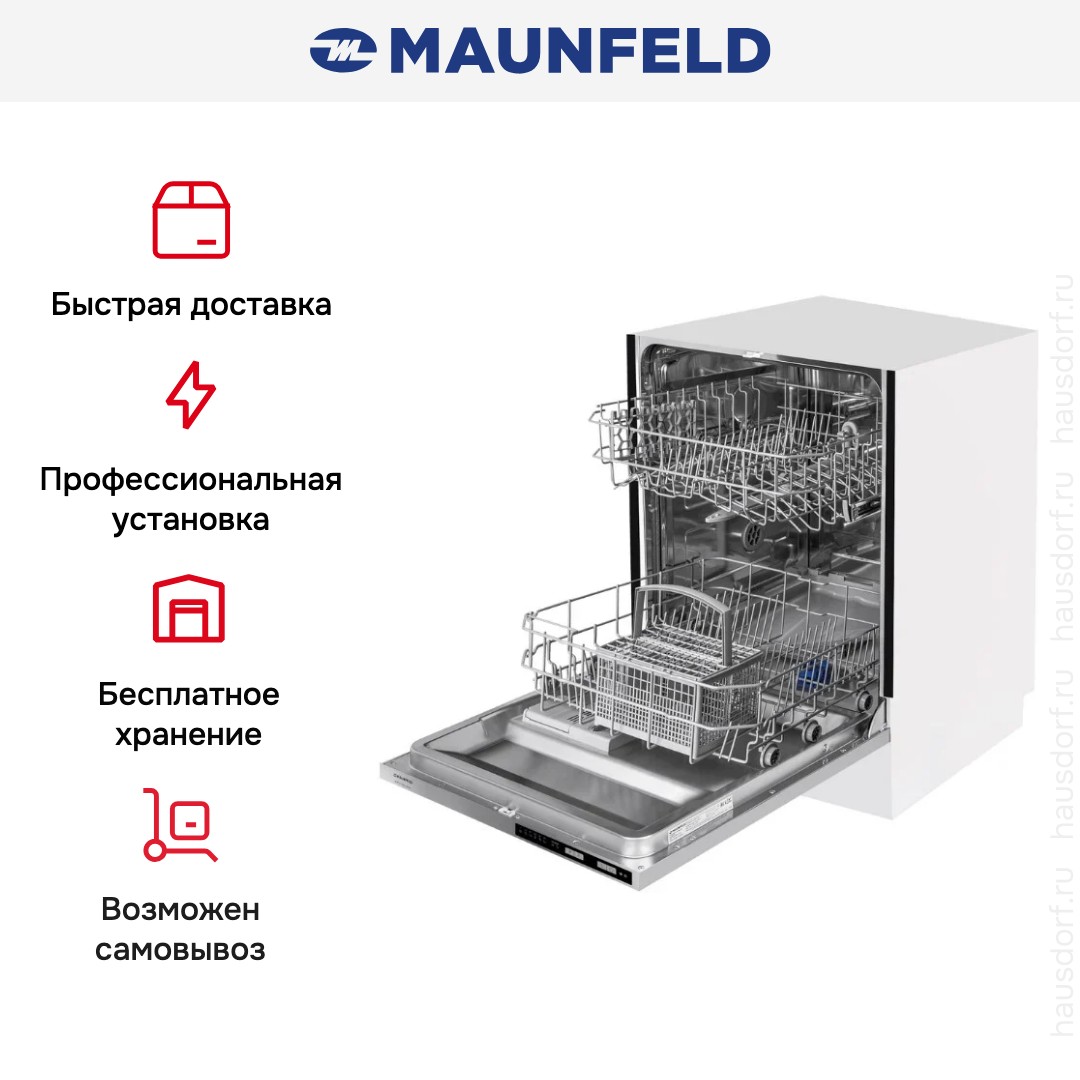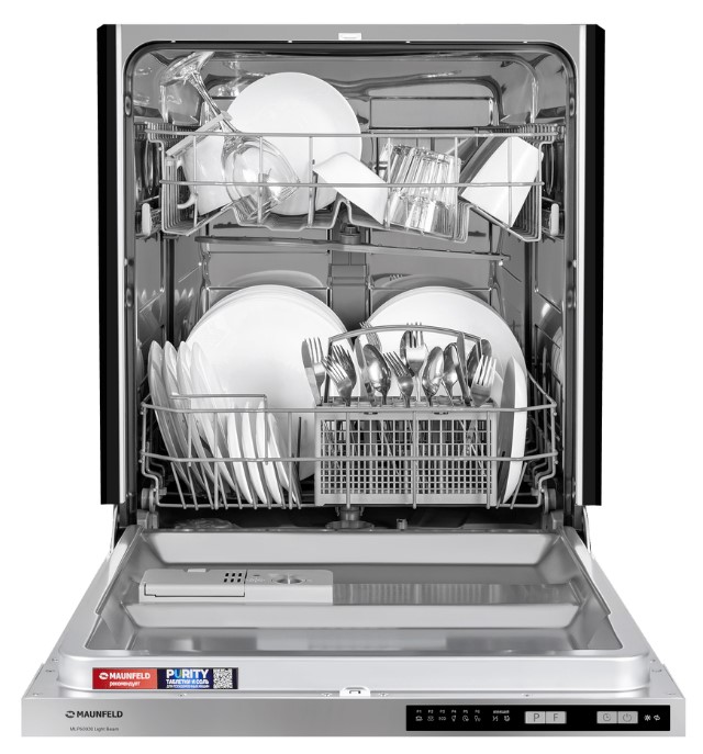 Встраиваемая модель Маунфилд отлично впишется в любой интерьер, главное — правильно выбрать место, чтобы подвести коммуникации. Устанавливается в нишу целиком, полностью закрывается декоративной панелью. Обратите внимание: в комплекте не идет фасад, его необходимо установить самостоятельно. Имеет стандартные размеры, поэтому может не поместиться на очень маленькой кухне. В камеру можно загрузить ограниченное число комплектов: 12 шт. Комплектом считается набор посуды на одного человека, который нужен для полноценного приема пищи: глубокая и плоская тарелки, тарелка для салата, блюдце под чашку, сама чашка, ложка и вилка.