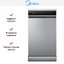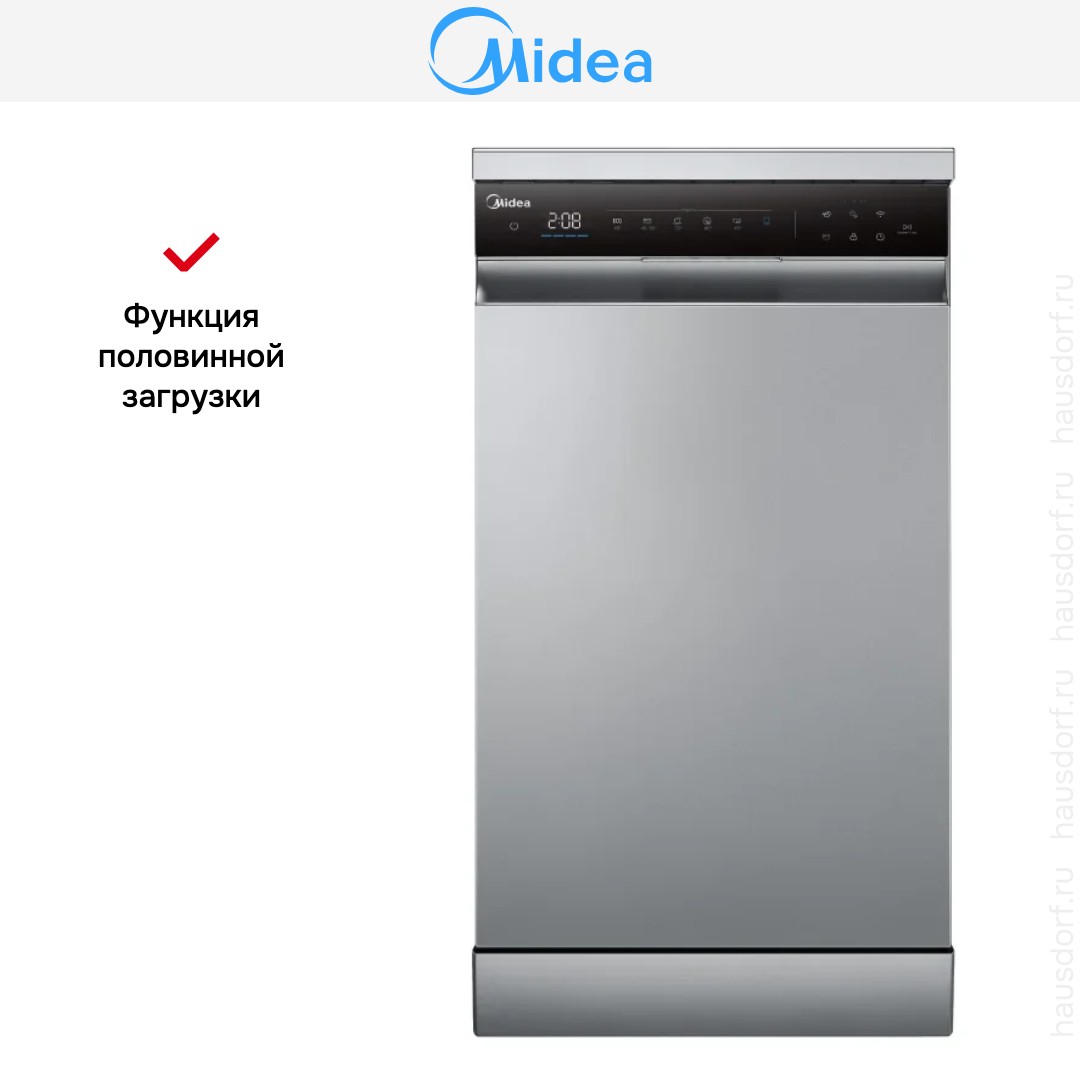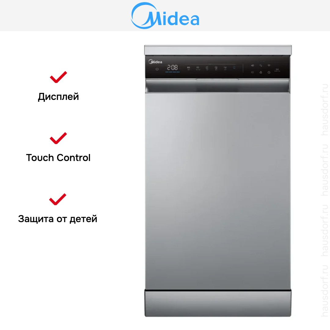 Отдельностоящая посудомоечная машина Midea MFD45S350SI выполнена в сдержанном серебристом цвете с черной открытой панелью управления на фронтальной части. Компактный узкий корпус 84.5×44.8×60 см экономит место на кухне и легко вписывается в нишу за счет стандартной глубины. Элегантное сочетание металлика и черного пластика придает технике аккуратный современный вид. Сенсорные клавиши и информативный дисплей скрыты на поверхности для минималистичного оформления.