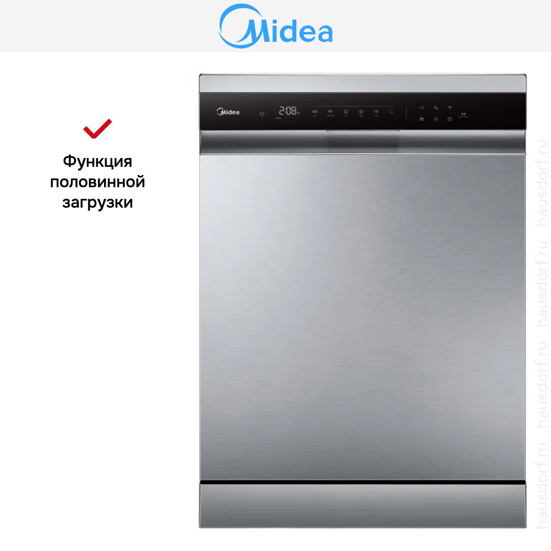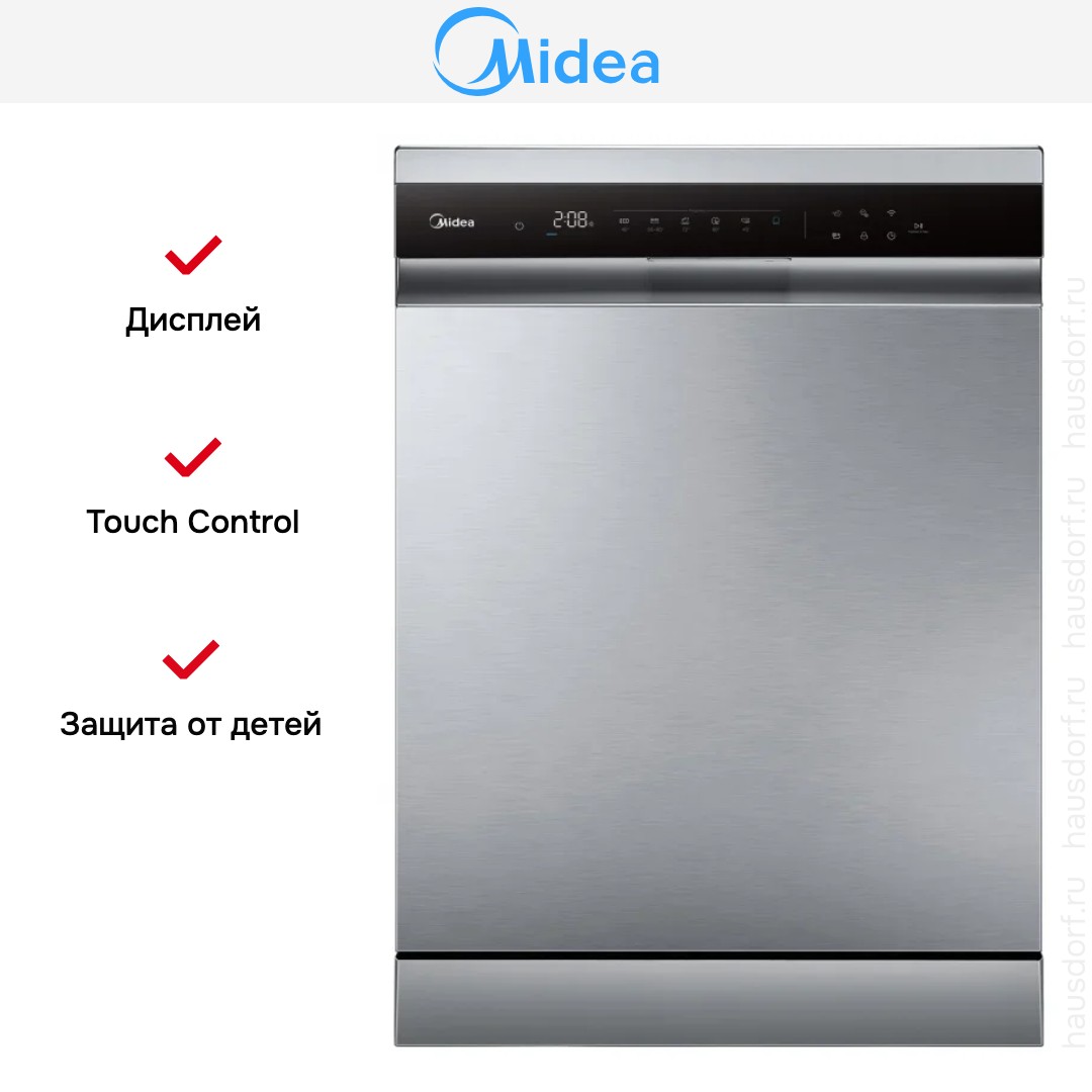 Посудомоечная машина Midea MFD60S350SI. Эта отдельностоящая полноразмерная модель имеет лаконичный серебристый корпус и чёрную панель управления, которая становится логичным акцентом на кухне и легко вписывается в современные интерьеры. Габариты 84.5×59.8×60 см соответствуют стандартным нишам и позволяют разместить прибор в большинстве кухонных планировок без дополнительных переделок.