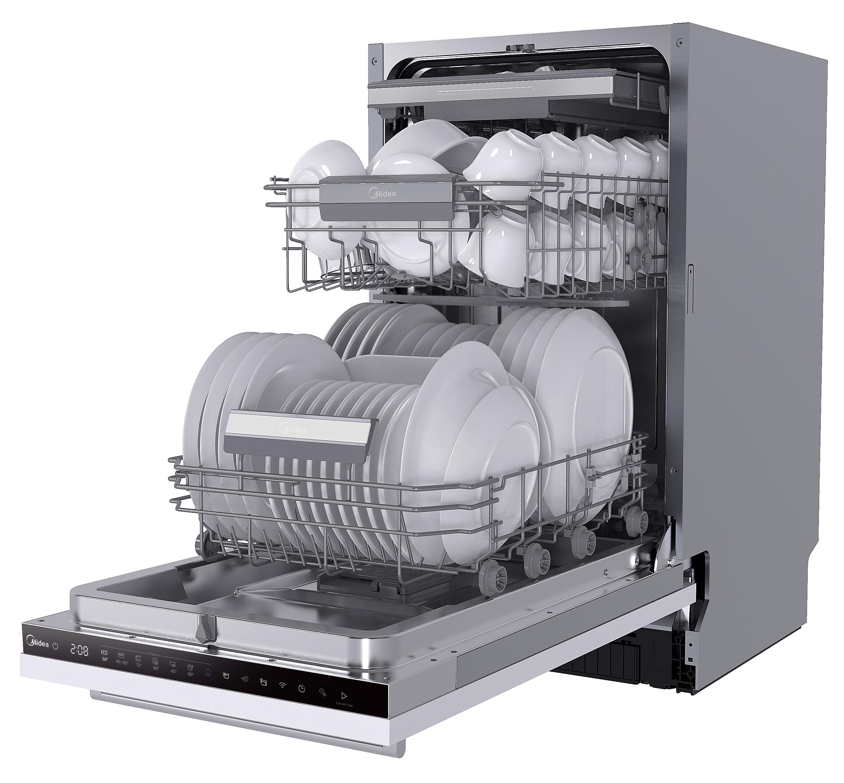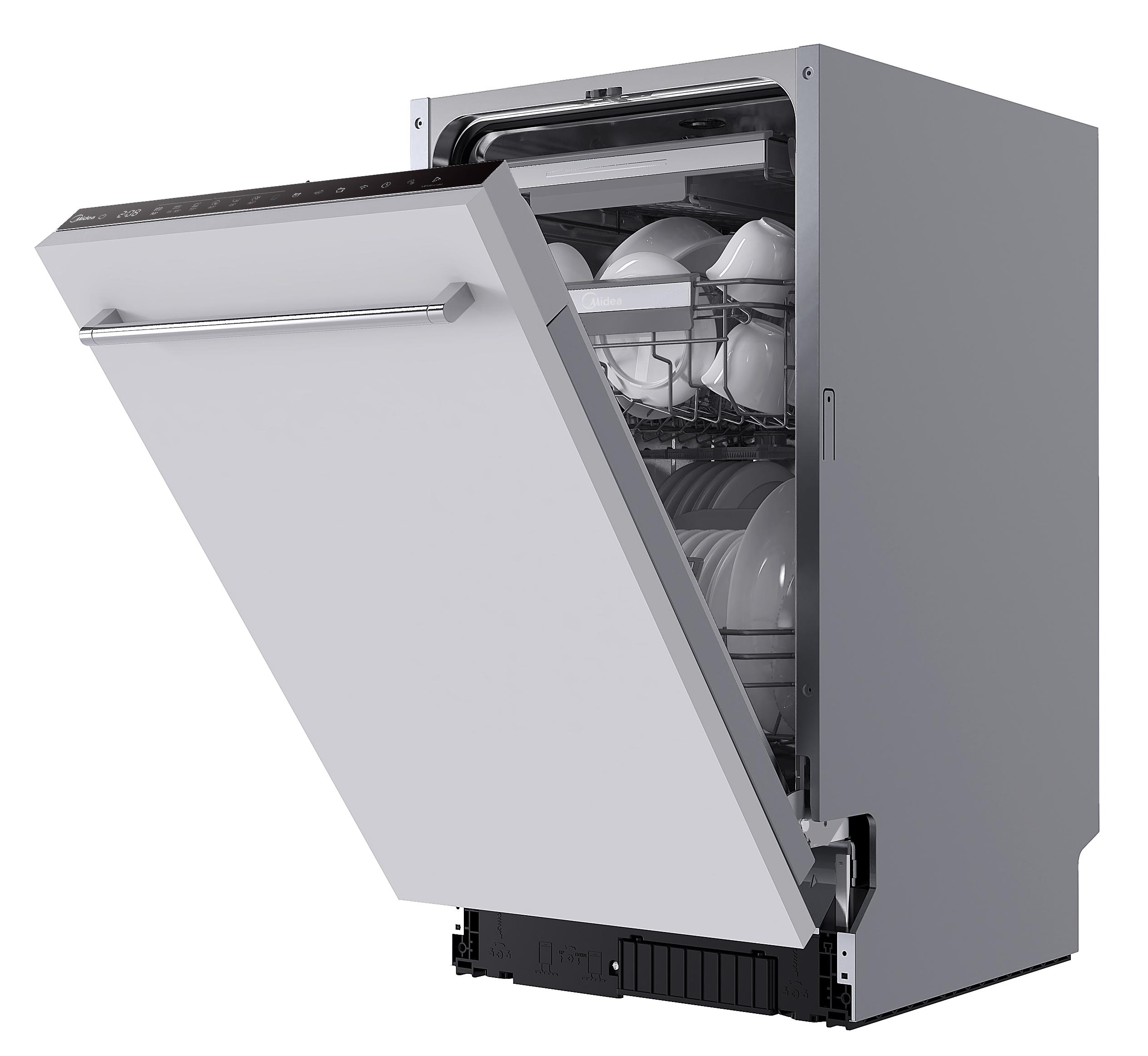 Встраиваемая модель Мидеа отлично впишется в любой интерьер, главное — правильно выбрать место, чтобы подвести коммуникации. Устанавливается в нишу целиком, полностью закрывается декоративной панелью. Обратите внимание: в комплекте не идет фасад, его необходимо установить самостоятельно. Имеет уменьшенную ширину — благодаря этому поместится даже на очень маленькой кухне. В камеру можно загрузить ограниченное число комплектов: 10 шт. Комплектом считается набор посуды на одного человека, который нужен для полноценного приема пищи: глубокая и плоская тарелки, тарелка для салата, блюдце под чашку, сама чашка, ложка и вилка.