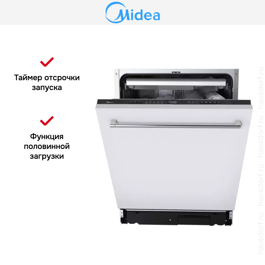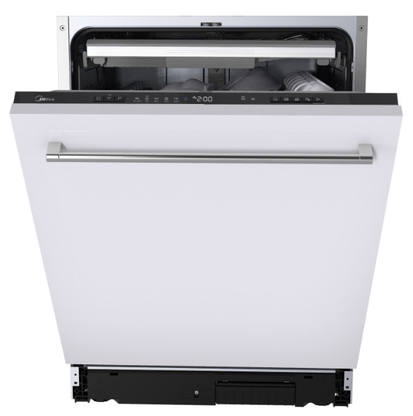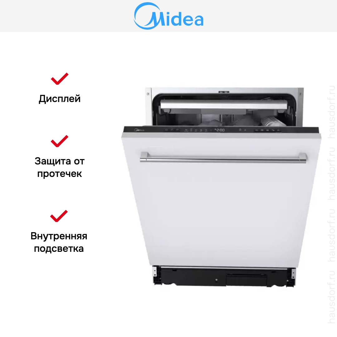 Встраиваемая модель Мидеа отлично впишется в любой интерьер, главное — правильно выбрать место, чтобы подвести коммуникации. Устанавливается в нишу целиком, полностью закрывается декоративной панелью. Обратите внимание: в комплекте не идет фасад, его необходимо установить самостоятельно. Имеет стандартные размеры, поэтому может не поместиться на очень маленькой кухне. В камеру можно загрузить ограниченное число комплектов: 14 шт. Комплектом считается набор посуды на одного человека, который нужен для полноценного приема пищи: глубокая и плоская тарелки, тарелка для салата, блюдце под чашку, сама чашка, ложка и вилка.