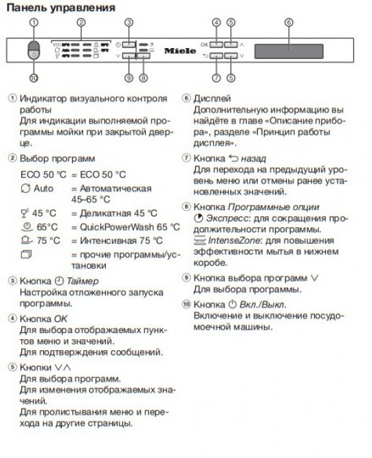 Все кнопки и индикаторы сопровождаются условными обозначениями (пиктограммами) и несколько реже — подписями. У разных производителей обозначения могут быть различными, однако основные символы более или менее совпадают. Как правило, на панель управления выносятся прежде всего кнопки включения прибора, запуска цикла мытья (обычно подписанная Start), а также выбора режима работы с указанием температуры мытья. У большинства моделей в их состав входят режимы интенсивной мойки для сильно загрязненной посуды с изображением кастрюли, стандартной мойки с изображением тарелок, деликатной для стекла и хрупких предметов (изображен бокал), экономичной программы ЕСО. У некоторых производителей для выбора режима предназначается всего одна кнопка, которую необходимо нажимать последовательно, до включения нужного индикатора.