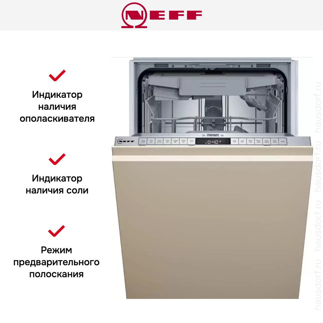 Посудомоечная машина Neff S875EMX05E — полностью встраиваемая узкая модель, созданная для аккуратной интеграции в мебель вашей кухни. Ее габариты 81.5×44.8×55 см и стандартный размер ниши 81.5×45×55 см позволяют установить прибор в компактный модуль. Передняя часть рассчитана под фасад вашего шкафа, а панель управления выполнена в серебристом цвете и скрыта за дверцей. Такой подход обеспечивает единый стиль кухни и удобный доступ к управлению при закрытой панели.