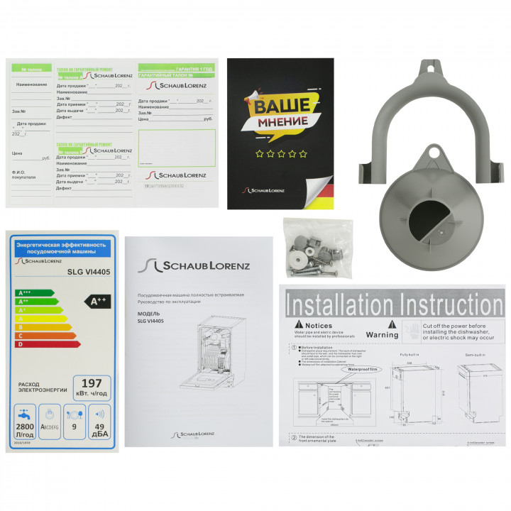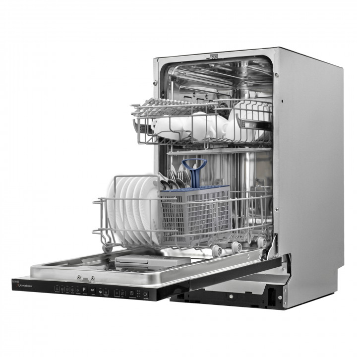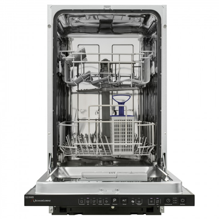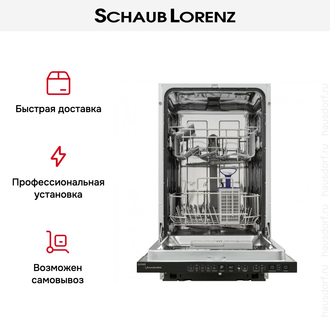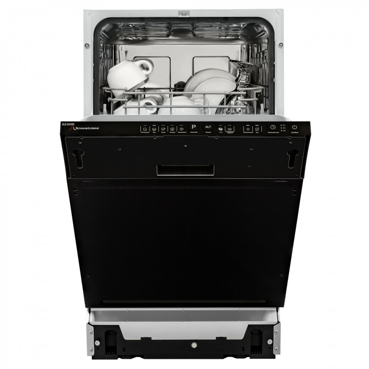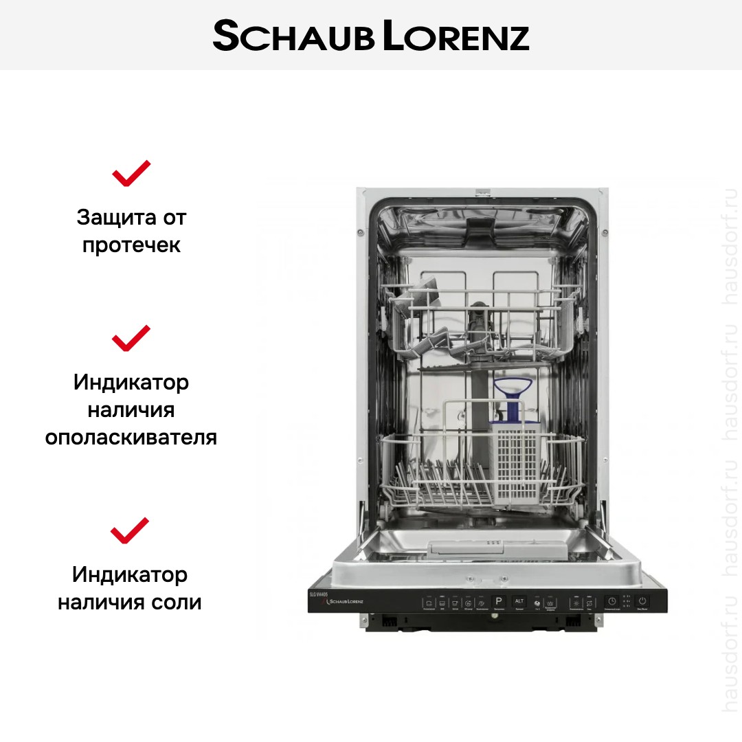 Встраиваемая модель Шауб Лоренц отлично впишется в любой интерьер, главное — правильно выбрать место, чтобы подвести коммуникации. Устанавливается в нишу целиком, полностью закрывается декоративной панелью. Имеет стандартные размеры, поэтому может не поместиться на очень маленькой кухне. В камеру можно загрузить ограниченное число комплектов: 9 шт. Комплектом считается набор посуды на одного человека, который нужен для полноценного приема пищи: глубокая и плоская тарелки, тарелка для салата, блюдце под чашку, сама чашка, ложка и вилка.