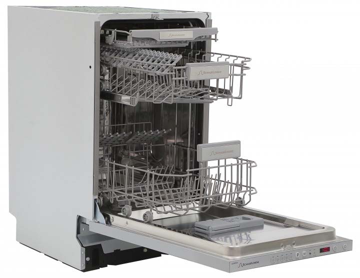 Встраиваемая модель Шауб Лоренц отлично впишется в любой интерьер, главное — правильно выбрать место, чтобы подвести коммуникации. Устанавливается в нишу целиком, полностью закрывается декоративной панелью. Обратите внимание: в комплекте не идет фасад, его необходимо установить самостоятельно. Имеет уменьшенную ширину — благодаря этому поместится даже на очень маленькой кухне. В камеру можно загрузить ограниченное число комплектов: 11 шт. Комплектом считается набор посуды на одного человека, который нужен для полноценного приема пищи: глубокая и плоская тарелки, тарелка для салата, блюдце под чашку, сама чашка, ложка и вилка.