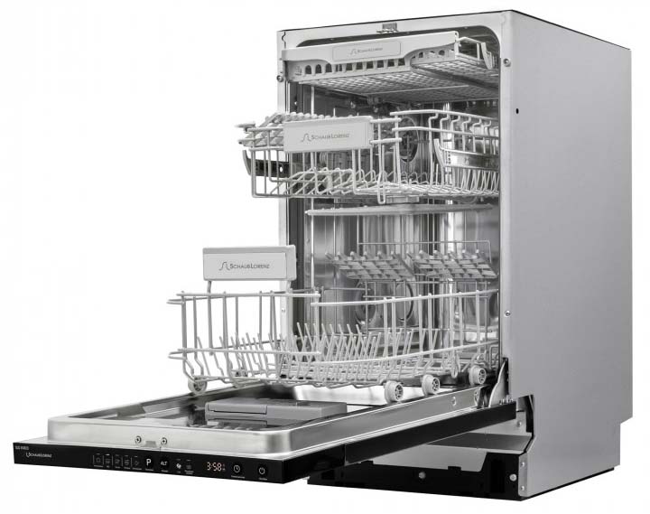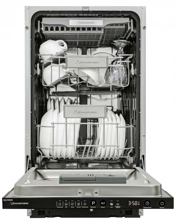 Полноразмерные модели выбирают в больших семьях, а также те, кто много готовит или часто принимает гостей. Их вместимость может составить до 15 комплектов посуды, а габаритные размеры соответствуют размерам стандартной кухонной мебели шириной и глубиной 60 см и высотой 82-85 см. Они выпускаются как во встраиваемом, так и в отдельностоящем варианте: во втором случае для установки понадобится достаточно много места. Как правило, полноразмерные приборы отличаются большим набором стандартных и специальных программ мойки, а также дополнительных опций: в частности, они оснащаются третьей корзиной для мытья столовых приборов.