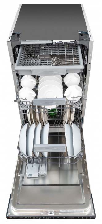Узкие посудомоечные машины при стандартной высоте около 85 см и глубине 60 см имеют небольшую ширину порядка 45 см. Эти устройства выпускаются в основном во встраиваемом варианте. Их выбирают для установки в малометражных кухнях, для небольших семей из двух-трех человек, а также в случае, если пользователи нечасто готовят дома. Вместимость узких машин может составить от 5 до 10 комплектов посуды, а по своему функционалу, классу мытья, разнообразию типов сушки они постепенно приближаются к полноразмерным моделям. Компактные модели рассчитаны на одного-двух человек. Их высота составляет всего 45 см, а ширина и глубина достигают 50-55 см. Вместимость подобных устройств не превышает 3-6 стандартных комплектов посуды. Производители предлагают как встраиваемые, так и отдельностоящие модели таких посудомоек: вторые обычно выделяют в отдельную категорию настольных. Они уступают узким и полноразмерным не только по вместимости, но и по набору функций, который включает, как правило, несколько стандартных программ.