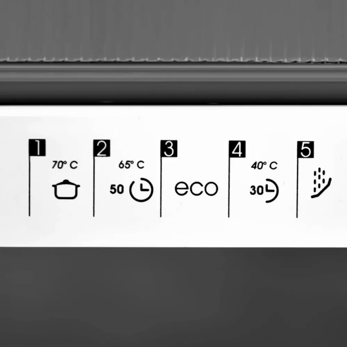 Управление посудомоечной машиной позволяет выбирать температуру мытья, длительность цикла, а также дополнительные опции. Панель управления может располагаться на фасаде прибора, если ПММ отдельностоящая или настольная, или на торце дверцы у встраиваемых моделей.