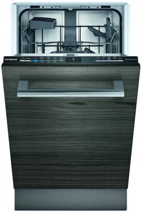 Встраиваемая модель Сименс отлично впишется в любой интерьер, главное — правильно выбрать место, чтобы подвести коммуникации. Устанавливается в нишу целиком, полностью закрывается декоративной панелью. Обратите внимание: в комплекте не идет фасад, его необходимо установить самостоятельно. Имеет уменьшенную ширину — благодаря этому поместится даже на очень маленькой кухне. В камеру можно загрузить ограниченное число комплектов: 11 шт. Комплектом считается набор посуды на одного человека, который нужен для полноценного приема пищи: глубокая и плоская тарелки, тарелка для салата, блюдце под чашку, сама чашка, ложка и вилка.