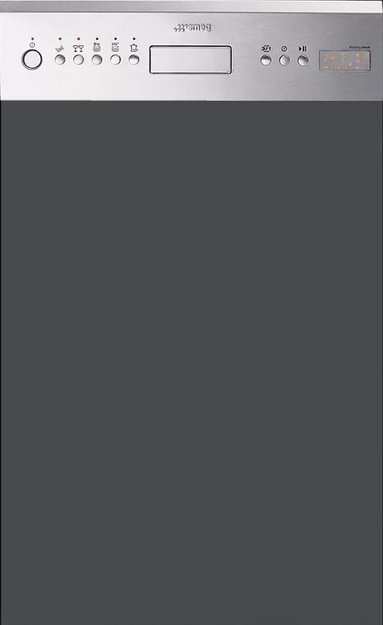 Узкая встраиваемая посудомоечная машина от немецкого производителя элитной бытовой техники Smeg отличается большой вместимостью, не смотря на свою миниатюрную компактность. Smeg PLA4645X7 оснащена регулируемой по высоте корзиной, которая может вместить целых 10 комплектов посуды. Вы оцените девять стандартных программ и конденсационную сушку.
