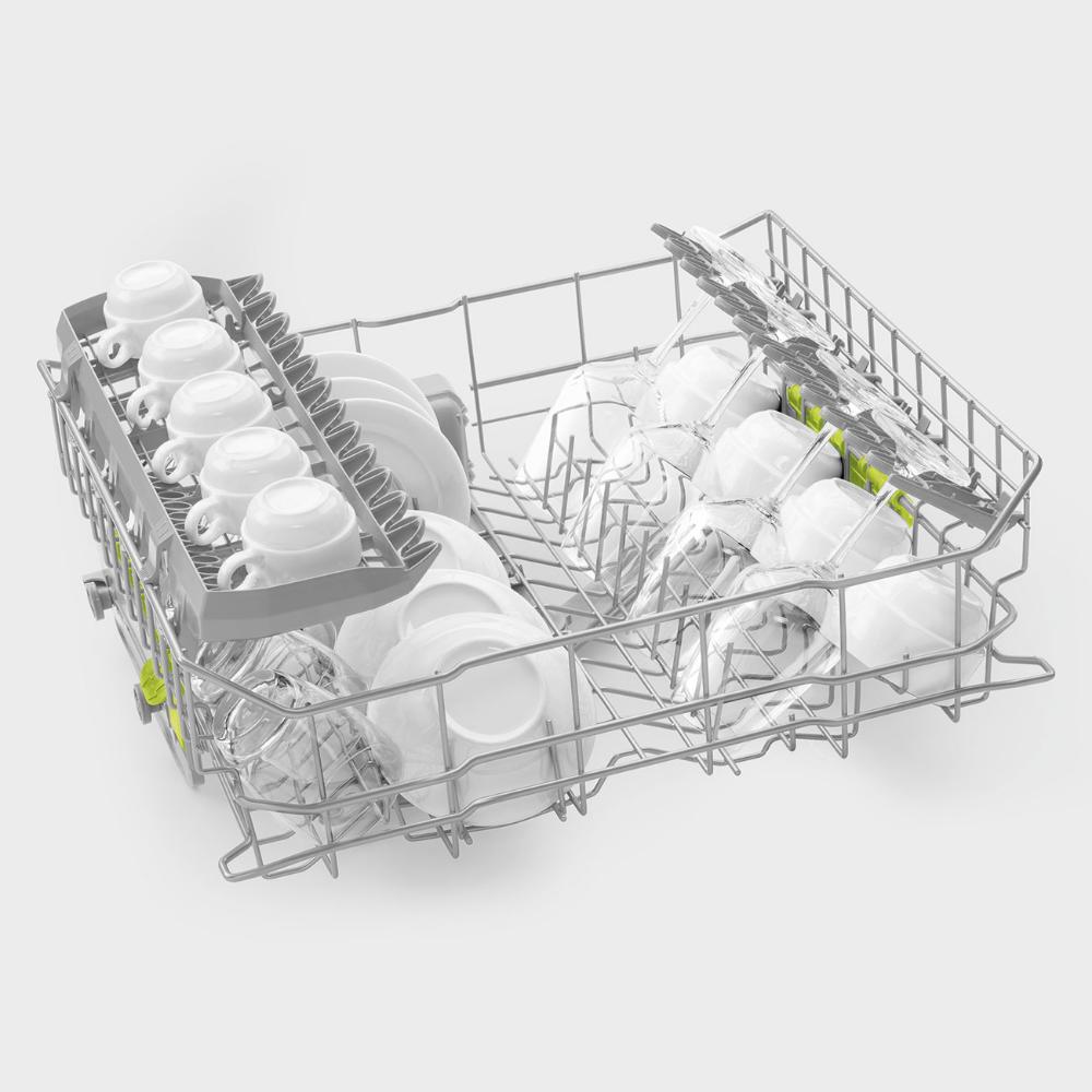 В данной модели две основные корзины: верхнюю можно регулировать по высоте на трех уровнях, нижняя оборудована держателями и специальными насадками, ускоряющими сушку (благодаря им тарелки не соприкасаются с металлическими прутьями — и влага быстрее уходит). Столовые приборы размещаются в отдельной корзинке.