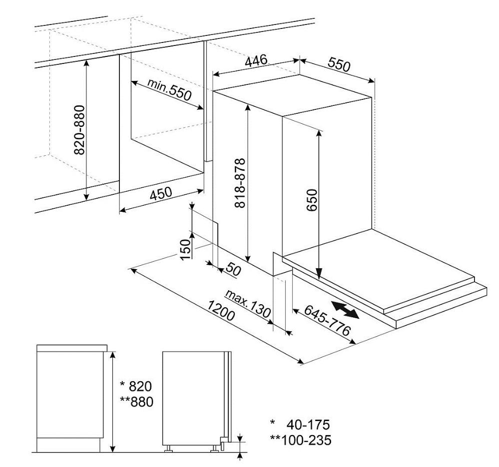 Большая часть полноразмерных и узких посудомоек встраиваемого и отдельностоящего вида имеет высоту около 82-85 см: такие модели легко размещаются под столешницей. Встраиваемые модели несколько ниже, так как у них отсутствует верхняя крышка.