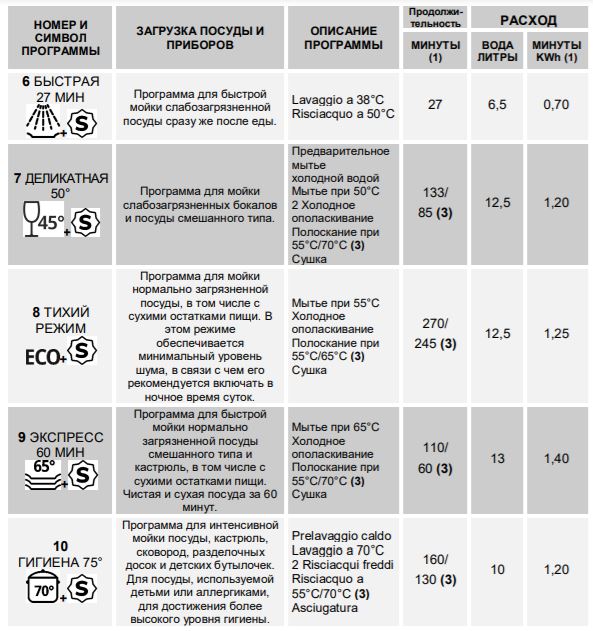 - экономичная с сокращением потребления воды и электроэнергии и увеличением длительности цикла для слабо загрязненной посуды;