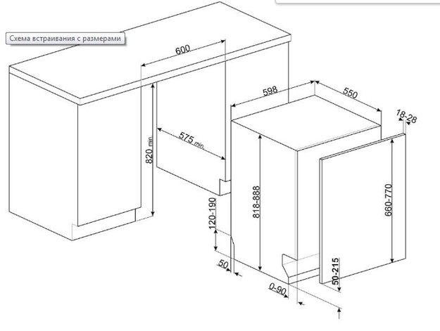 Большая часть полноразмерных и узких посудомоек встраиваемого и отдельностоящего вида имеет высоту около 82-85 см: такие модели легко размещаются под столешницей. Встраиваемые модели несколько ниже, так как у них отсутствует верхняя крышка.
