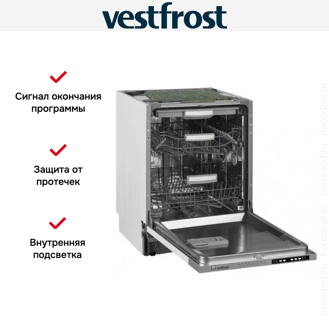 Vestfrost VFDW 6041 — полноразмерная модель встраиваемого типа установки. Рабочая камера устройства одновременно вмещает до 15 стандартных комплектов посуды. Для размещения столовых приборов, в том числе длинных ножей или половников, предусмотрена специальная третья корзина. Безопасная эксплуатация прибора обеспечивается системой Aquastop, надежно защищающей от утечек.