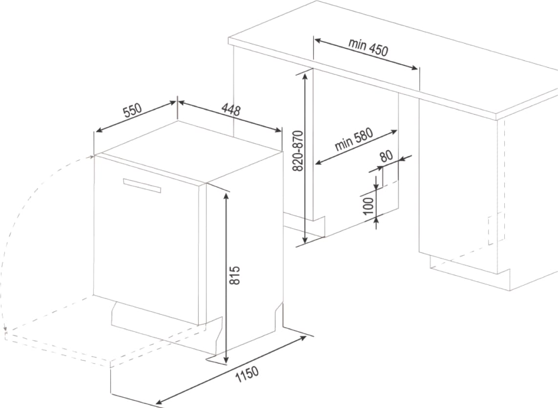 Большая часть полноразмерных и узких посудомоек встраиваемого и отдельностоящего вида имеет высоту около 82-85 см: такие модели легко размещаются под столешницей. Встраиваемые модели несколько ниже, так как у них отсутствует верхняя крышка.