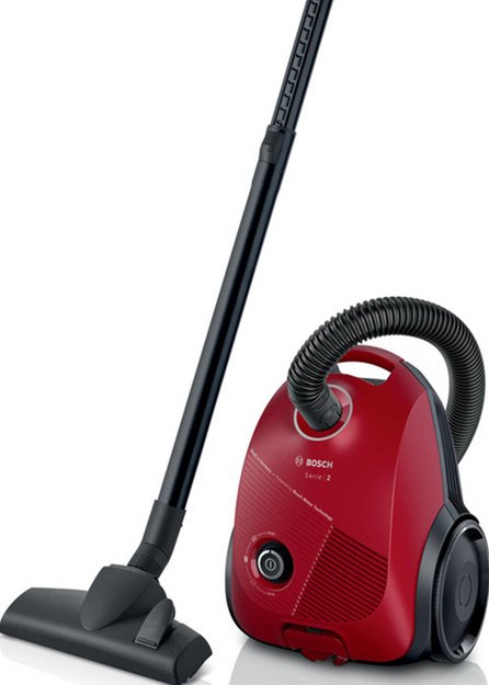 Пылесос Bosch BGBS2RD1 имеет стандартную конфигурацию — корпус на колесах, крепящийся к нему шланг с трубками-удлинителями и насадками. Данная модель рассчитана только на сухую уборку, которой достаточно для большинства пользователей. Мощный поток воздуха позволяет быстро всасывать как мелкие, так и крупные частицы, волосы и шерсть. Основной цвет прибора — красный. Пылесборник-мешок — привычный вариант, с которым легко работать, можно не беспокоиться о чрезмерном расходе электроэнергии. Он тщательно запирает внутри крупную пыль, но может незначительно пропускает очень мелкие частицы. Объем заполнения пылесборника — 3.5 л.