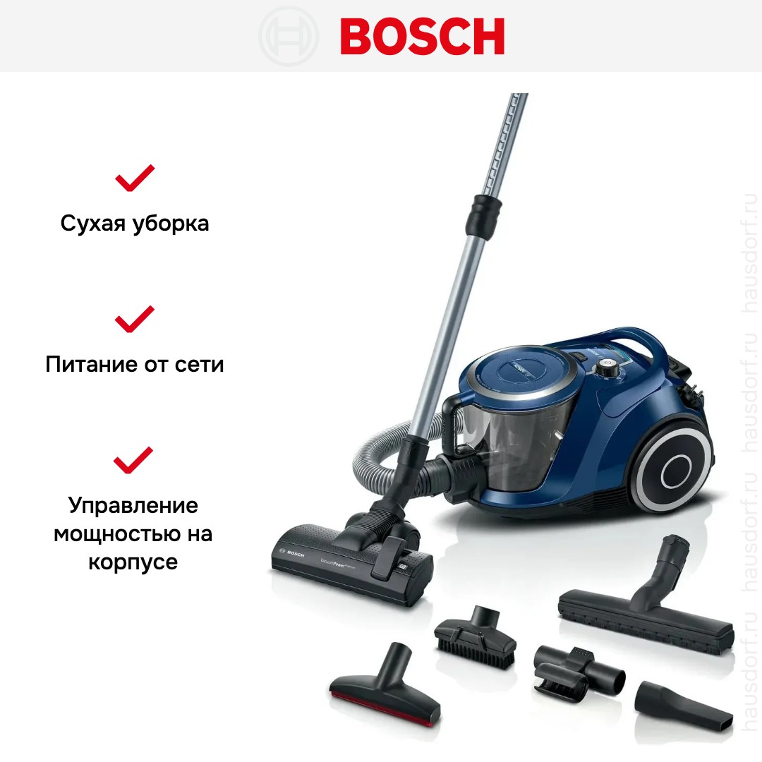 Пылесос Bosch BGC41X36 имеет стандартную конфигурацию — корпус на колесах, крепящийся к нему шланг с трубками-удлинителями и насадками. Данная модель рассчитана только на сухую уборку, которой достаточно для большинства пользователей. Мощный поток воздуха позволяет быстро всасывать как мелкие, так и крупные частицы, волосы и шерсть. Основной цвет прибора — синий. В качестве пылесборника производитель установил стандартный контейнер. Пользоваться им легко и удобно: чтобы очистить, просто достаньте его и высыпьте все в мусорное ведро, а затем протрите или вымойте емкость изнутри. Объем заполнения пылесборника — 2.4 л.
