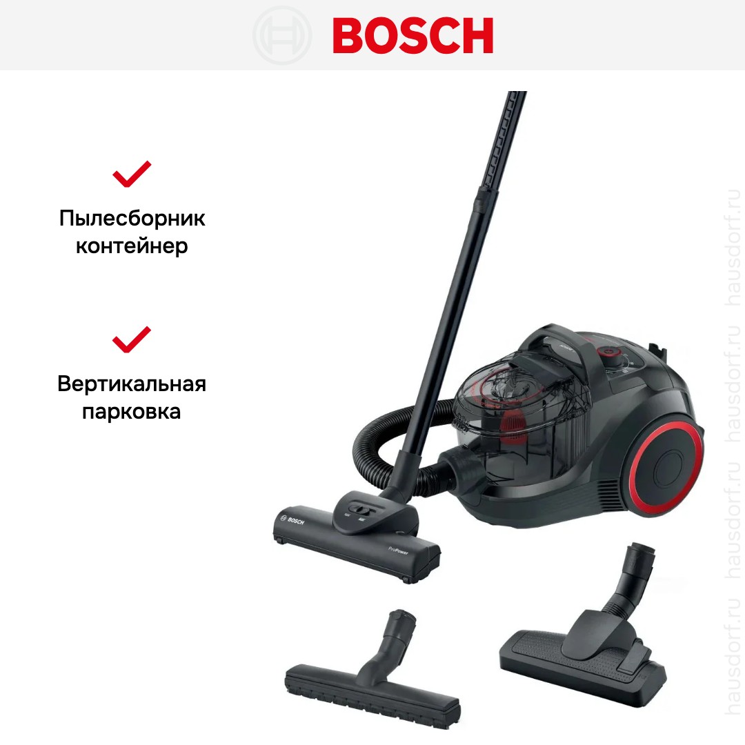 Пылесос Bosch BGS21POW2 имеет стандартную конфигурацию — корпус на колесах, крепящийся к нему шланг с трубками-удлинителями и насадками. Данная модель рассчитана только на сухую уборку, которой достаточно для большинства пользователей. Мощный поток воздуха позволяет быстро всасывать как мелкие, так и крупные частицы, волосы и шерсть. Основной цвет прибора — черный. В качестве пылесборника производитель установил стандартный контейнер. Пользоваться им легко и удобно: чтобы очистить, просто достаньте его и высыпьте все в мусорное ведро, а затем протрите или вымойте емкость изнутри. Объем заполнения пылесборника — 2 л.