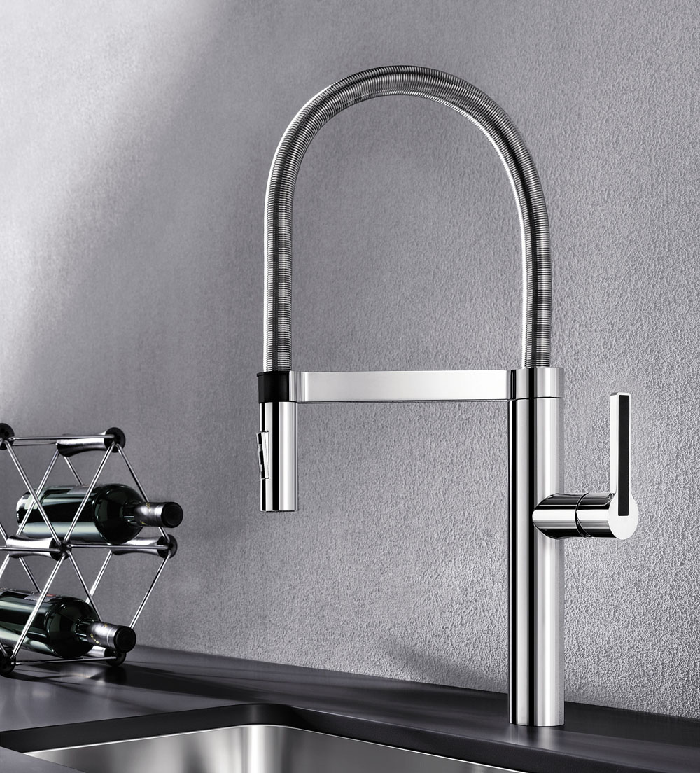 Специальная насадка позволяет выдвинуть излив как маленький шланг и направить струю в слишком высокую кастрюлю, которая не помещается под стационарным краном, на овощи в раковине, на загрязнения в неудобных уголках мойки, которые нужно удалить и т.д. Благодаря особой конструкции вы можете также направить воду из раковины в ванну или из одной чаши мойки в другую одним поворотом крана в нужную сторону. Дополнительная деталь, которая повышает комфорт использования, — аэратор. Он делает поток воды мягче, насыщая его кислородом, таким образом дополнительно уменьшая ее расход: объем струи увеличивается за счет воздуха, а не за счет повышения напора из водопровода.