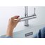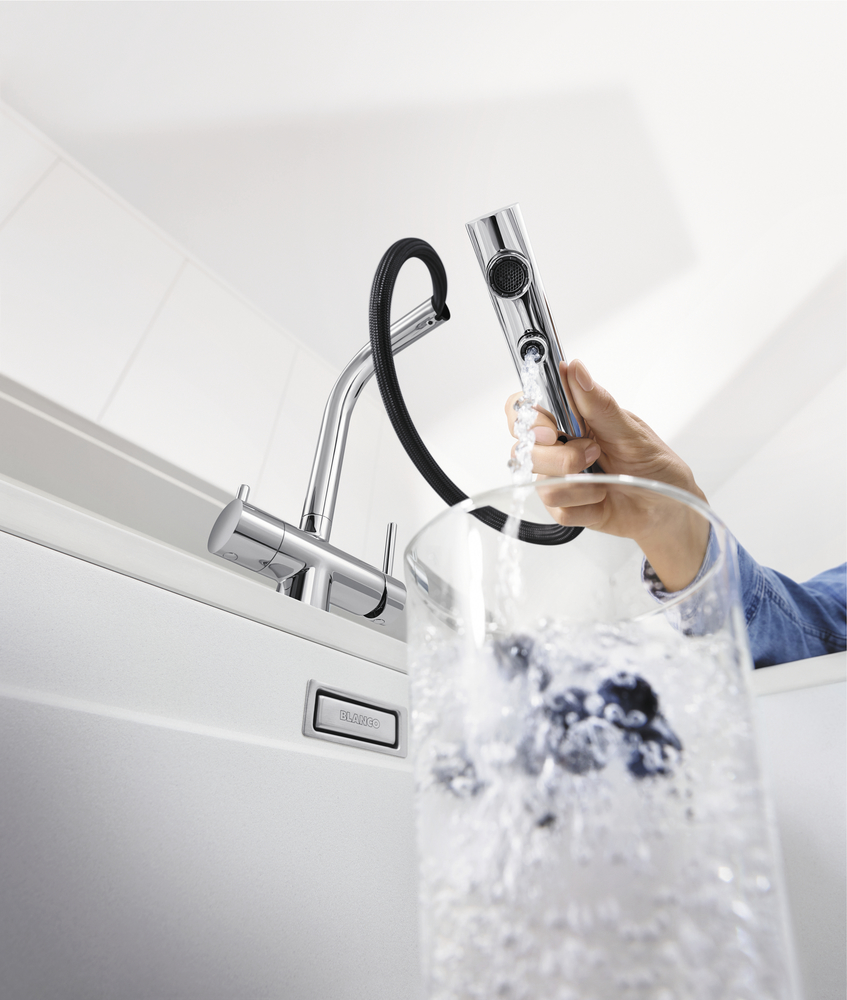 Специальная насадка позволяет выдвинуть излив как маленький шланг и направить струю в слишком высокую кастрюлю, которая не помещается под стационарным краном, на овощи в раковине, на загрязнения в неудобных уголках мойки, которые нужно удалить и т.д. Благодаря особой конструкции вы можете также направить воду из раковины в ванну или из одной чаши мойки в другую одним поворотом крана в нужную сторону. Дополнительная деталь, которая повышает комфорт использования, — аэратор. Он делает поток воды мягче, насыщая его кислородом, таким образом дополнительно уменьшая ее расход: объем струи увеличивается за счет воздуха, а не за счет повышения напора из водопровода. К этой модели можно подключить фильтр для питьевой воды.