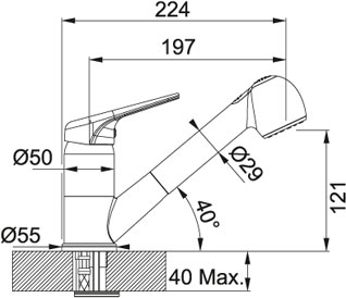 Длиной излива называется расстояние по горизонтали от основания смесителя до точки в раковине, куда падает струя воды. Учитывать длину при выборе смесителя и мойки так же важно, как и высоту. Основной фактор выбора: струя должна попадать в середину раковины, а не на одну из боковых поверхностей, чтобы не забрызгать столешницу и рядом стоящую бытовую технику. В идеале она должна попадать прямо на сливное отверстие, в крайнем случае место падения должно располагаться между сливным отверстием и передней стенкой. При этом нужно учитывать угол, под которым падает струя, а также расстояние от основания смесителя до ближайшей стенки раковины. Проводить измерения следует при максимальном напоре воды.