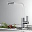 Выдвижной излив в кухонном смесителе — это гибкая трубка из резины в металлической оплетке, расположенная внутри основного излива. Для того, чтобы воспользоваться гибким изливом — например, наполнить высокую посуду, — достаточно включить воду и потянуть за головку, находящуюся на конце трубки.