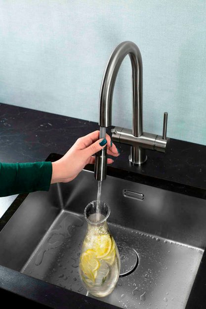 Специальная насадка позволяет выдвинуть излив как маленький шланг и направить струю в слишком высокую кастрюлю, которая не помещается под стационарным краном, на овощи в раковине, на загрязнения в неудобных уголках мойки, которые нужно удалить и т.д. Дополнительная деталь, которая повышает комфорт использования, — аэратор. Он делает поток воды мягче, насыщая его кислородом, таким образом дополнительно уменьшая ее расход: объем струи увеличивается за счет воздуха, а не за счет повышения напора из водопровода. К этой модели можно подключить фильтр для питьевой воды.