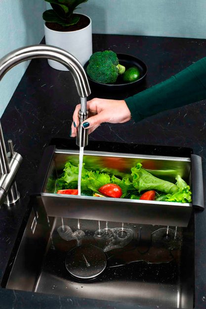 Внутри крана помещается шланг, который можно растянуть, чтобы достать струей воды до второй чаши мойки или тщательно сполоснуть посуду.