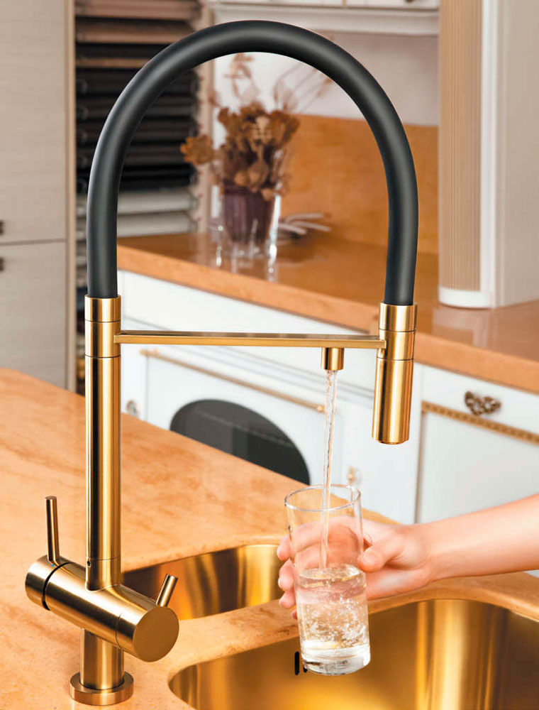 Рычаг для включения фильтрованной воды применяется в современных комбинированных смесителях, где из одного и того же излива подается и водопроводная, и питьевая вода. Такие смесители типа «два в одном» отличаются от обычных тем, что имеют не два подключения, а три, где третье соединяет смеситель с фильтром. Очищенная вода подается по изолированной трубке, проходящей внутри излива. Для удаления накипи, солей металлов, микроорганизмов и прочих вредных примесей могут применяться различные типы фильтров. Проточные фильтры устанавливаются под мойкой и включают несколько картриджей, которые необходимо менять по мере использования. С их помощью можно избавиться от таких примесей, как железо, хлор и многие другие. Устройства с системой обратного осмоса оснащаются диффузором, включающим картриджи для предварительной очистки и осмотическую мембрану, задерживающую практически все вредные примеси.