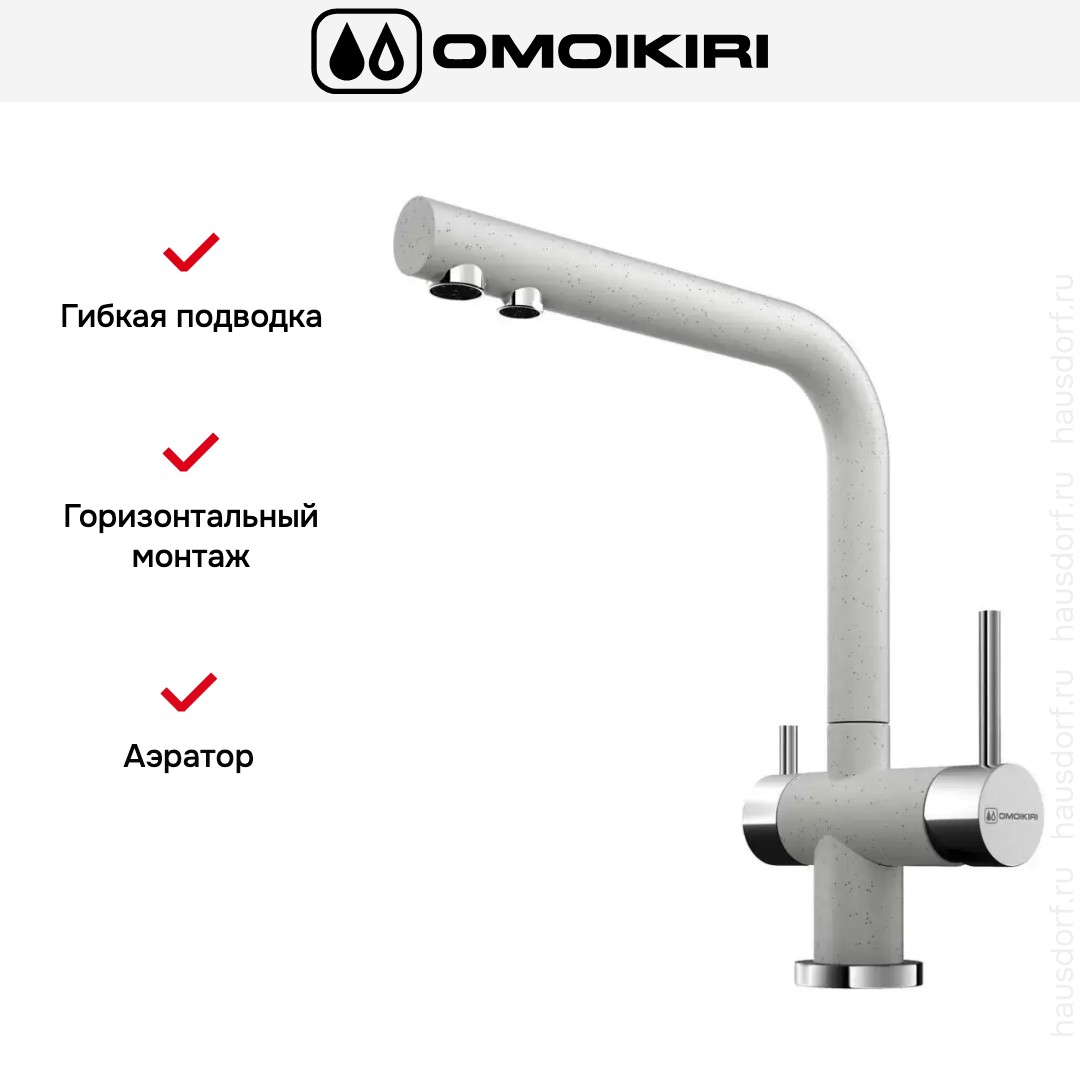 Модель Omoikiri NAGANO устанавливается привычным способом: на бортик мойки или ванной в предназначенные для этого отверстия (они могут быть вырезаны производителями заранее, но если нет, при достаточной ширине можно добавить их самостоятельно). Гибкая подводка позволяет расположить сантехнику в любом удобном месте, при этом нужно учитывать несколько важных нюансов: для максимальной надежности лучше выбирать сильфонные рукава, нельзя использовать ее вместо стационарного водопровода, только как соединительный элемент для крана.