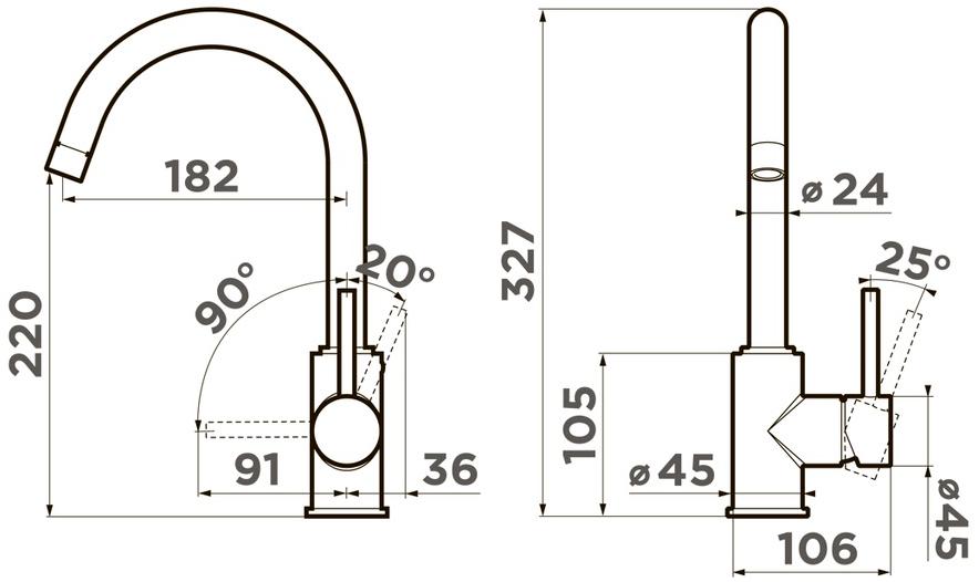 Смеситель классической формы — с плавным изгибом, который расположен на средней высоте относительно мойки. С ним комфортно мыть или наполнять глубокую посуду, при необходимости можно повернуть кран влево или вправо, например, чтобы не смешивать грязные тарелки с продуктами, которые нужно ополоснуть перед приготовлением.
