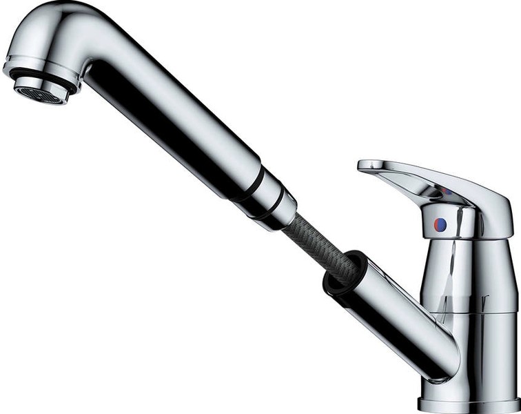 Выдвижной излив в кухонном смесителе — это гибкая трубка из резины в металлической оплетке, расположенная внутри основного излива. Для того, чтобы воспользоваться гибким изливом — например, наполнить высокую посуду, — достаточно включить воду и потянуть за головку, находящуюся на конце трубки.