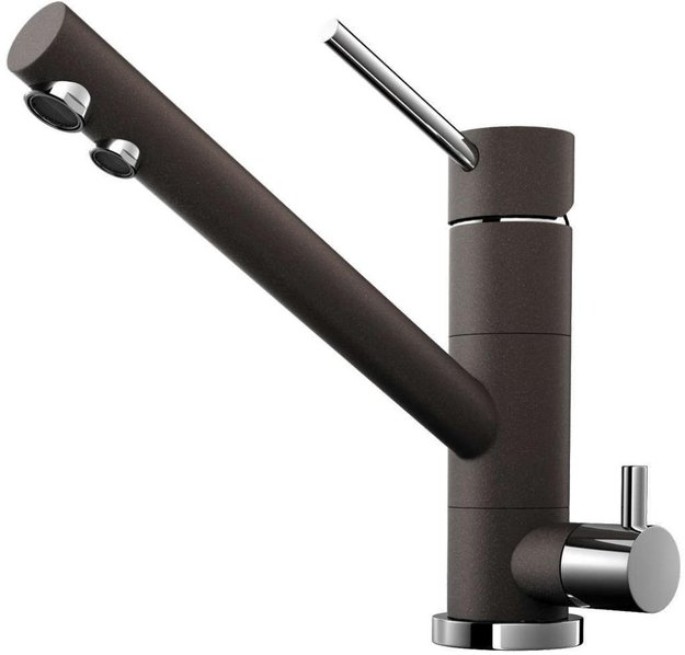 Рычаг для включения фильтрованной воды применяется в современных комбинированных смесителях, где из одного и того же излива подается и водопроводная, и питьевая вода. Такие смесители типа «два в одном» отличаются от обычных тем, что имеют не два подключения, а три, где третье соединяет смеситель с фильтром. Очищенная вода подается по изолированной трубке, проходящей внутри излива. Для удаления накипи, солей металлов, микроорганизмов и прочих вредных примесей могут применяться различные типы фильтров. Проточные фильтры устанавливаются под мойкой и включают несколько картриджей, которые необходимо менять по мере использования. С их помощью можно избавиться от таких примесей, как железо, хлор и многие другие. Устройства с системой обратного осмоса оснащаются диффузором, включающим картриджи для предварительной очистки и осмотическую мембрану, задерживающую практически все вредные примеси.